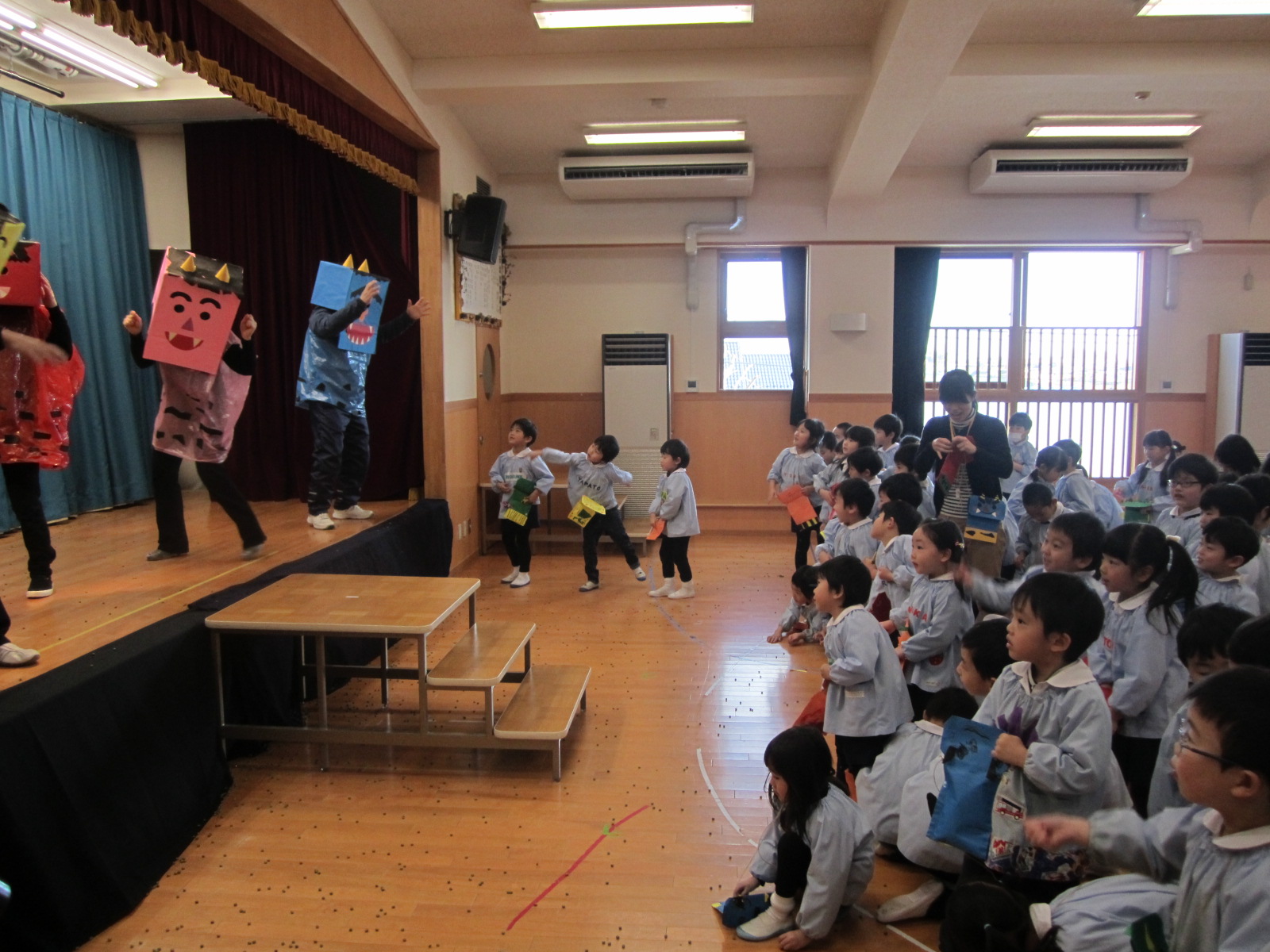 今日は、鶴ヶ谷幼稚園では豆まき会を行ないました。節分に豆まきをするのは、目には見えない邪気を追い払い、福を呼び込むためだと知り、みんなで声を揃えて「鬼は外!」「福は内!」と元気よく豆をまきました。ホールだけでなく保育室でも豆まきを行ない、「心の中にいた泣き虫鬼がいなくなったよ!」「野菜嫌い鬼がいなくなったぞ!」と、それぞれの心の中にいる鬼も追い払うことができたようでした。その後、年の数だけの豆を、おいしくいただきました。