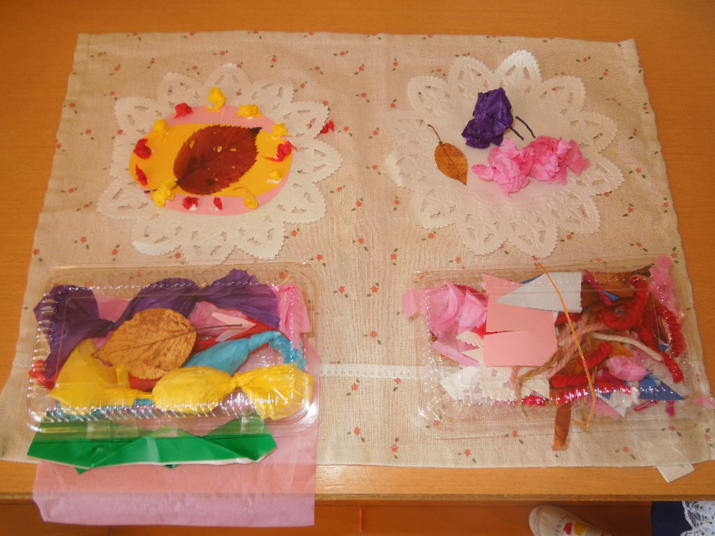 室内では、落ち葉を図鑑に挟んで押し葉作りをし、製作あそびに利用しています。「落ち葉のチョコケーキできあがり!」「落ち葉のふりかけもかけちゃおーっと!」と、アイディアを出し合いながら、工夫して作り上げる楽しさも味わっているようです。