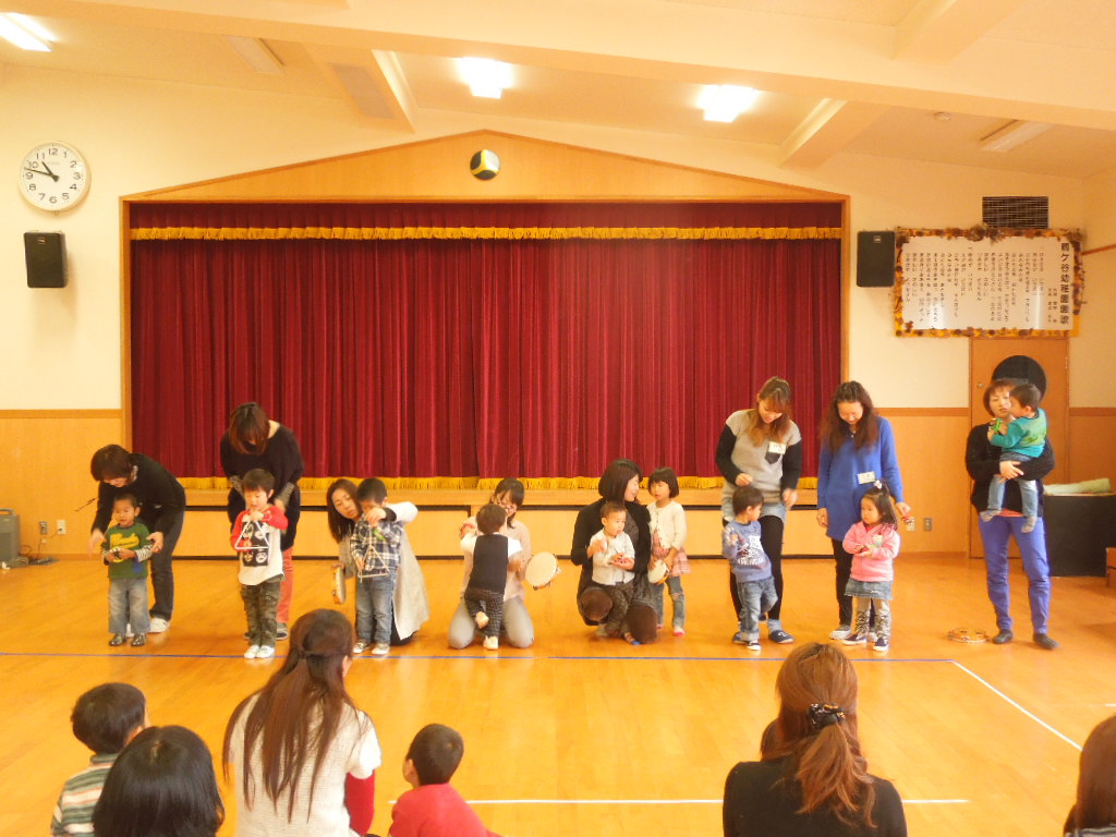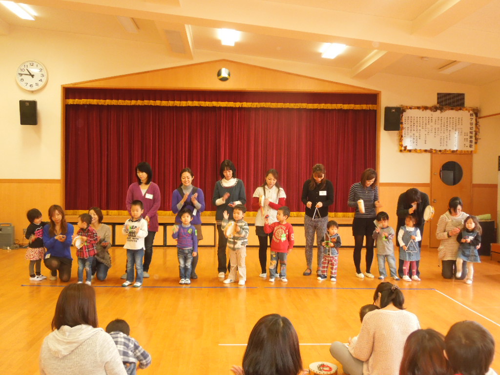 ハミングサークルで楽器あそびを行いました。親子で、カスタネット、タンバリン、トライアングル、すずの中から好きな楽器を選び“とんぼのめがね”と“てをたたきましょう”の曲に合わせて、楽器を鳴らすことを楽しみました。最後に2グループに分かれ合奏の発表会も行いました。自分の楽器の音を楽しんだり、リズムにのって鳴らしたりと親子で表現する楽しさを味わいました。“ジングルベル”の曲に合わせて合奏したこともあり、「サンタさんの歌だね~」とクリスマスへの期待も高まったようです。次回(12月5日)のハミングサークルは、クリスマス製作を予定しています。どうぞお楽しみに。