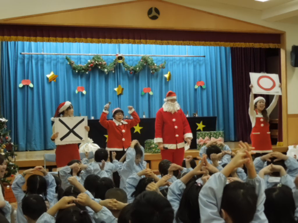 マイクサンタにイギリスに因んだ質問をいくつか行い、日本との違いを知ることができたようです。また、マイクサンタと一緒に〇×ゲームを行ったり、職員で奏でたハンドベルを聞いたりと盛りだくさんの会になりました。