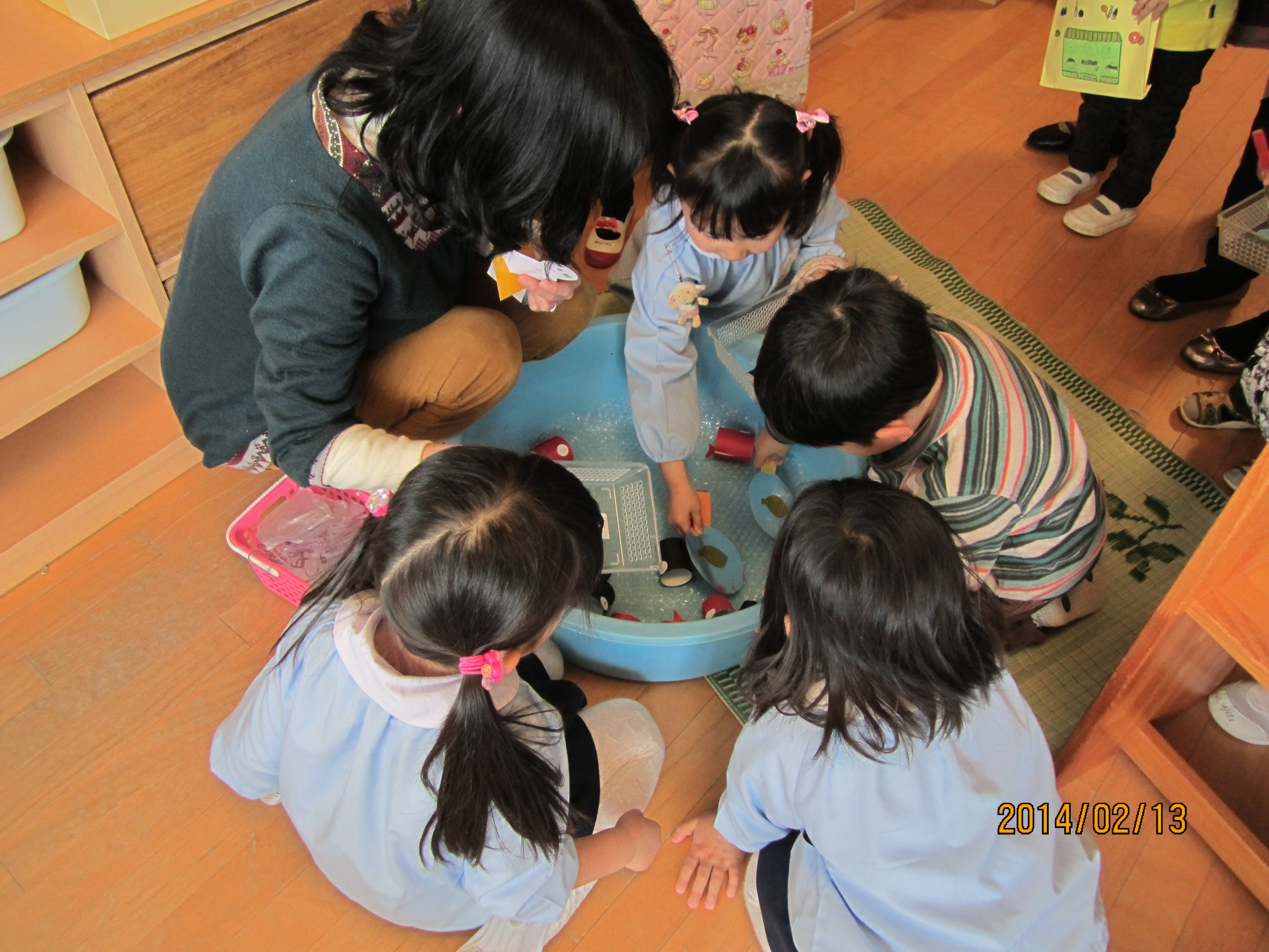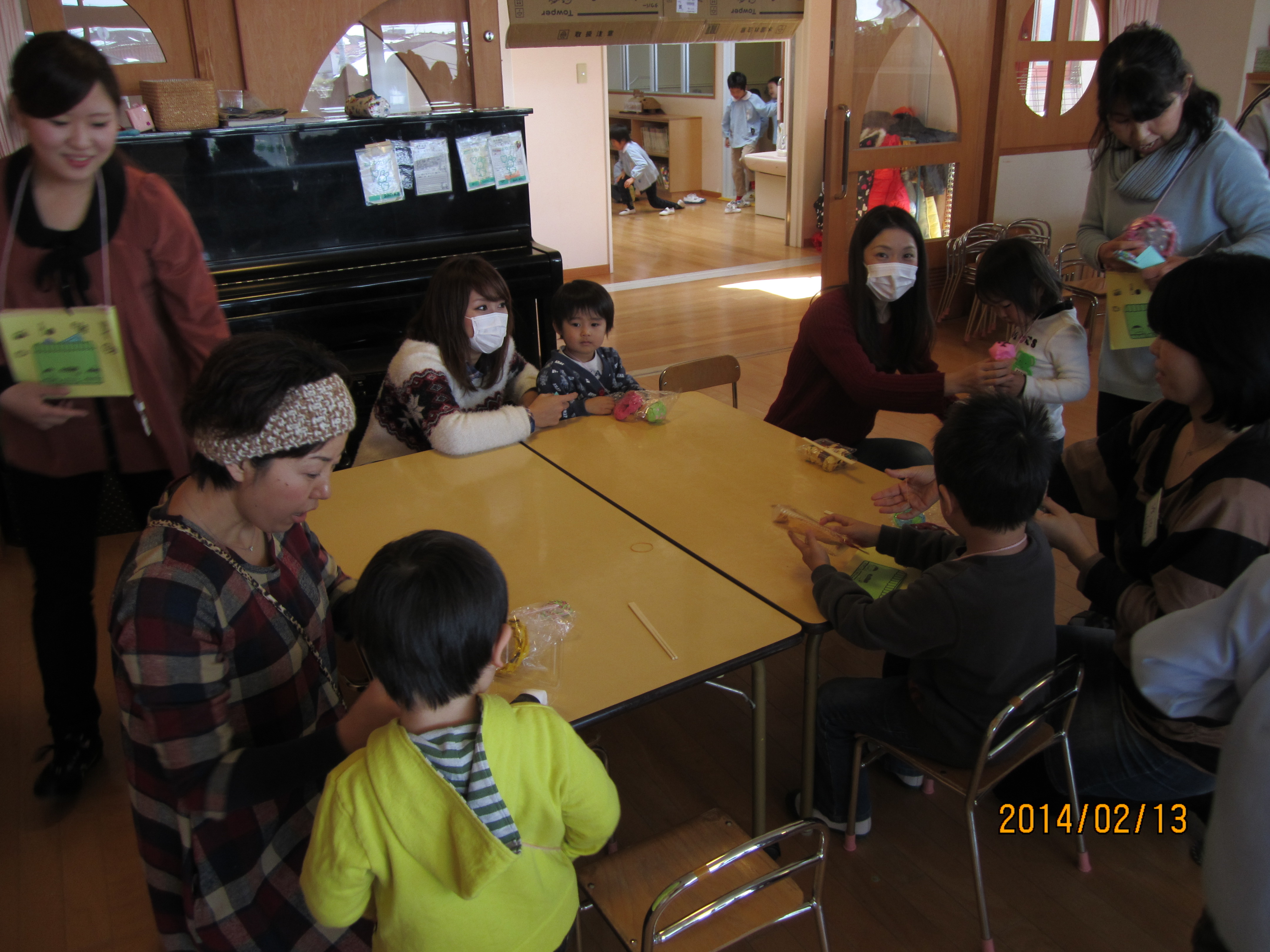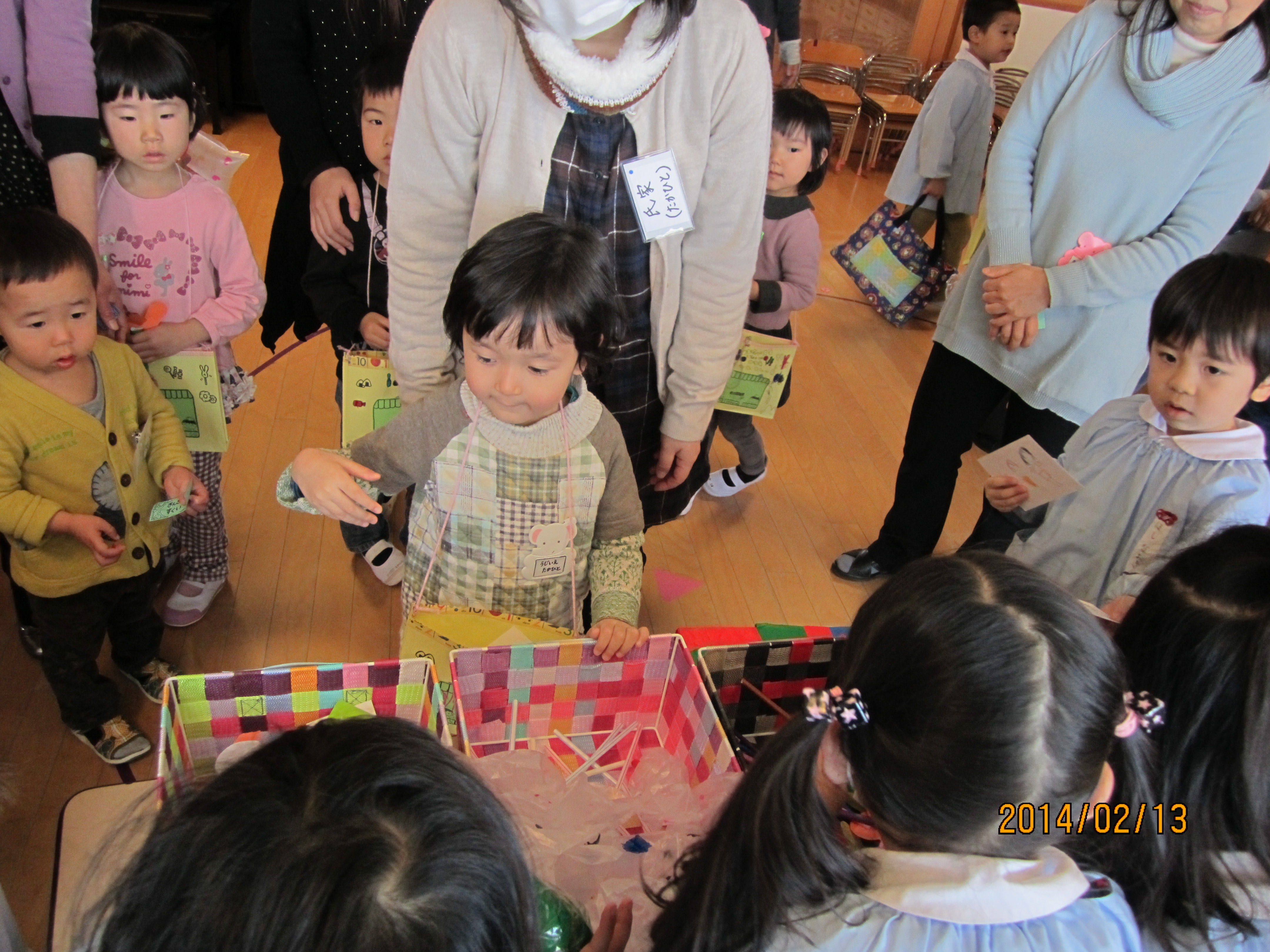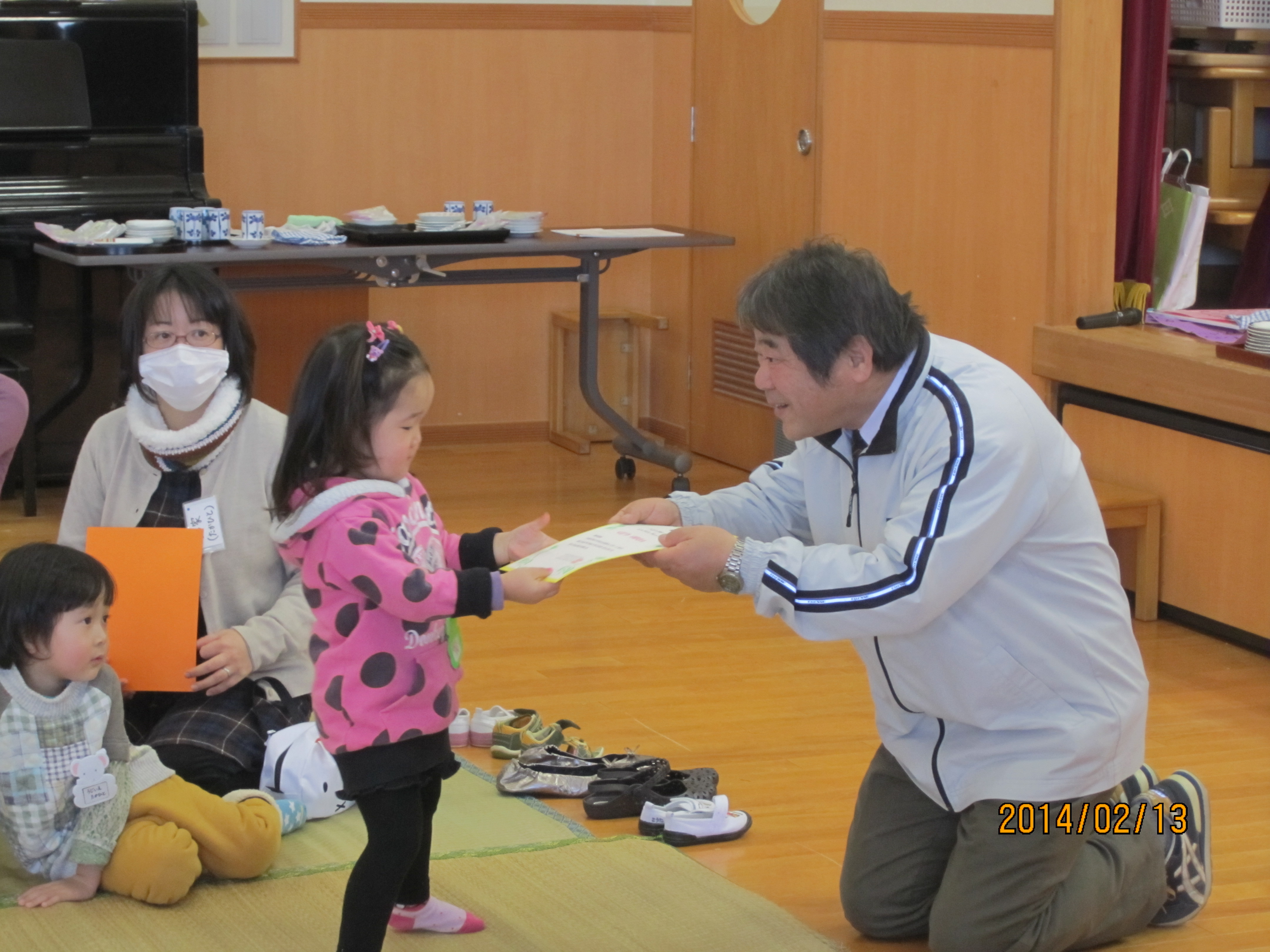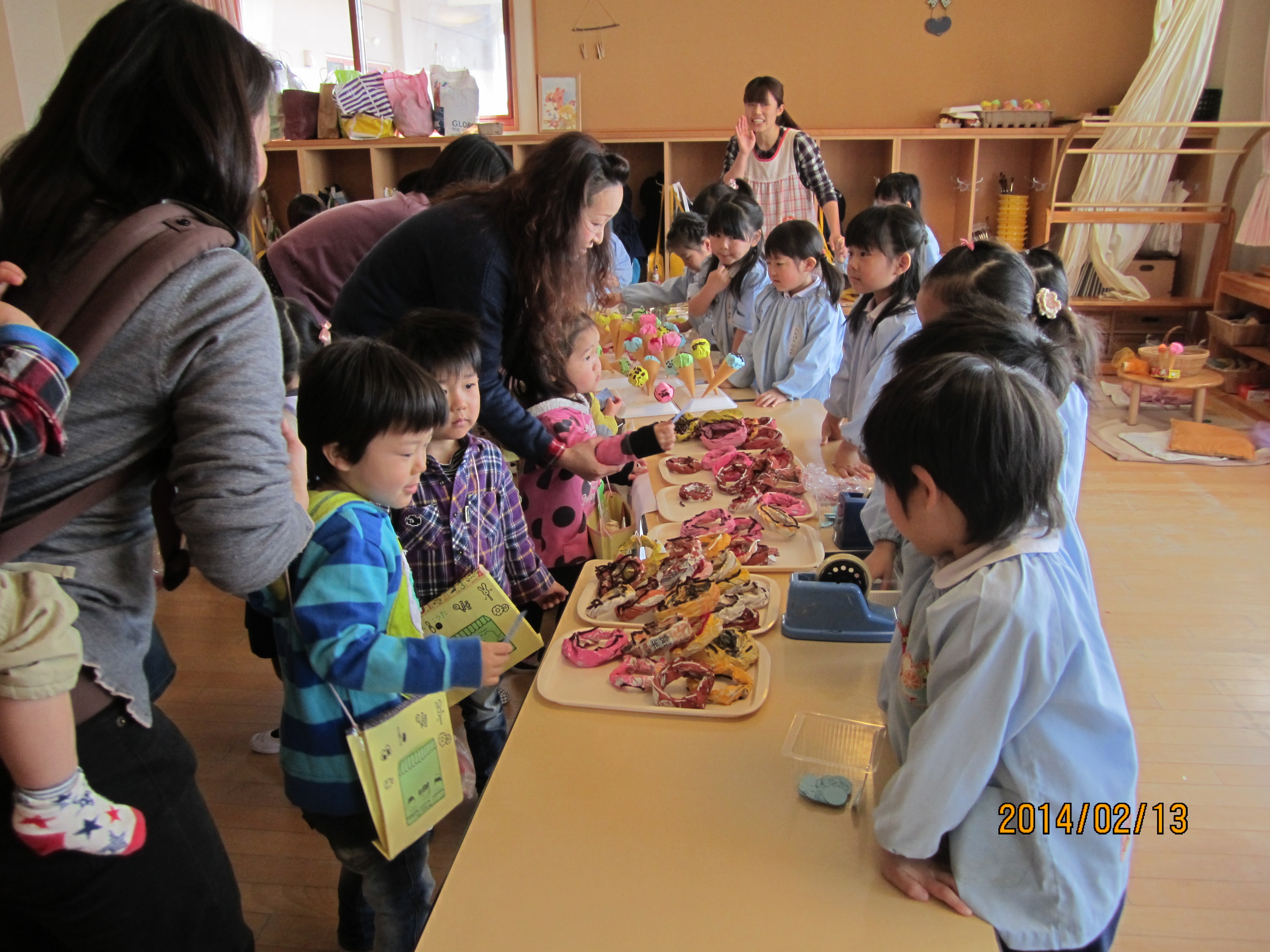 今日は、今年最後のハミングサークルでした。今回は、年中組さんが開いてくれたお店に親子で買い物に行きました。こどもたちは、少しドキドキしながらも「これ、ください」「ありがとう」と、年中組のお兄さん、お姉さんと会話のやりとりを楽しんでいました。買ったものをお友達と一緒に食べたり、たくさんの品物が入ったマイバックの中を見せ合ったり、親子でお店やさんごっこをしたりと、ホールに戻ってからもみんなで楽しみました。最後に、園長先生からお友達一人一人に『修了証書』が手渡されました。大きな声で返事をし胸を張って証書をいただく姿に、おおきな成長を感じました。同時にこの一年間の楽しかったことが、思い出されたひと時になりました。みなさん、一年間たくさんのご協力ありがとうございました。