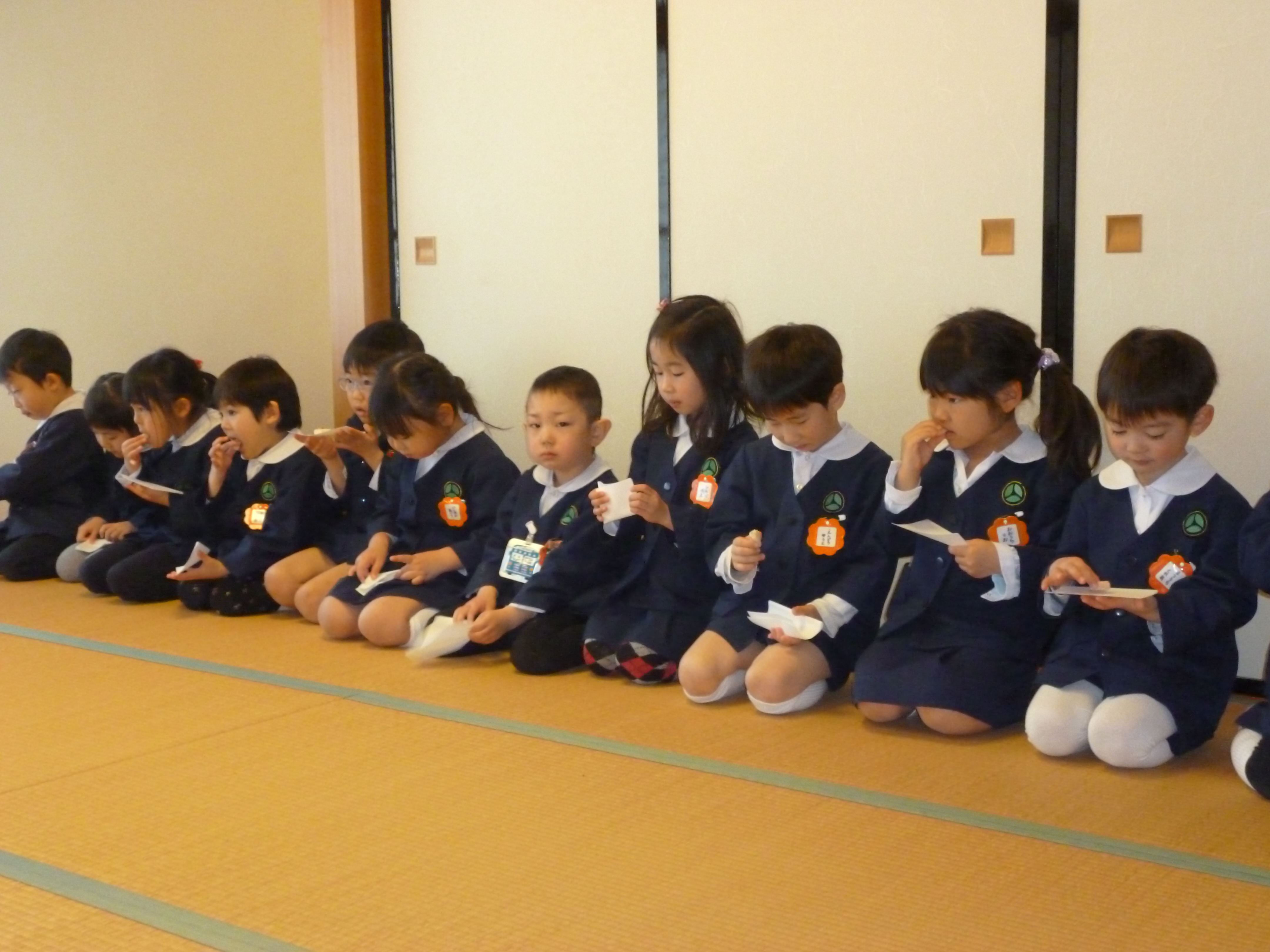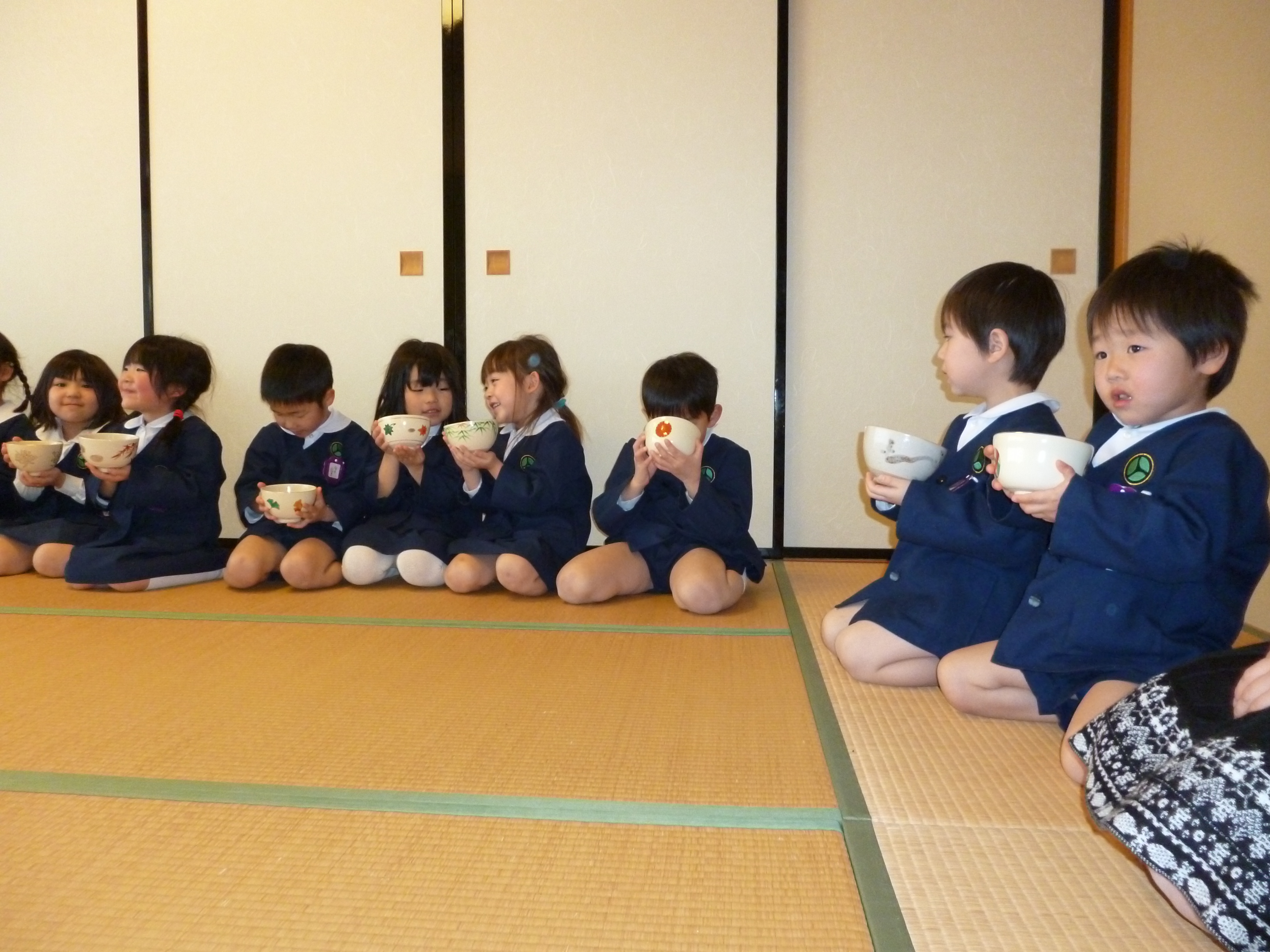 普段の保育室とは違う茶室の雰囲気に興味をもち、「床の間」や「ふすま」「障子」についての話を熱心に聞いていました。本日のお軸は「立雛」です。また、こどもたちの楽しみにしていたお菓子は「菱おこし」でした。「甘くておいしい!」と、喜んで味わっていました。初めて味わう抹茶も美味しくいただき、あっという間に飲んでいました。
