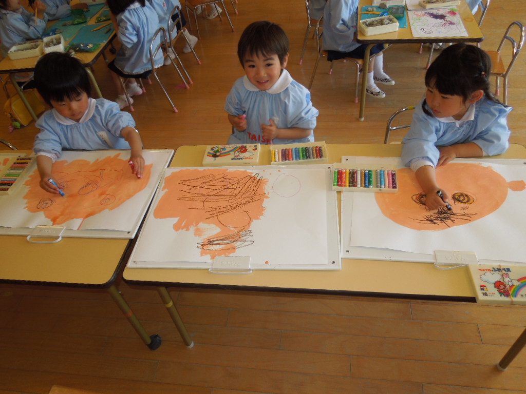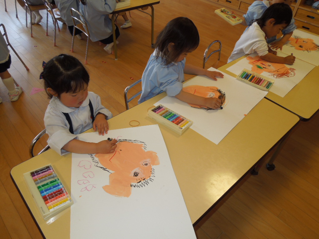 年少組のこどもたちは、絵の具とクレパスを使ってお母さんの絵を描きました。