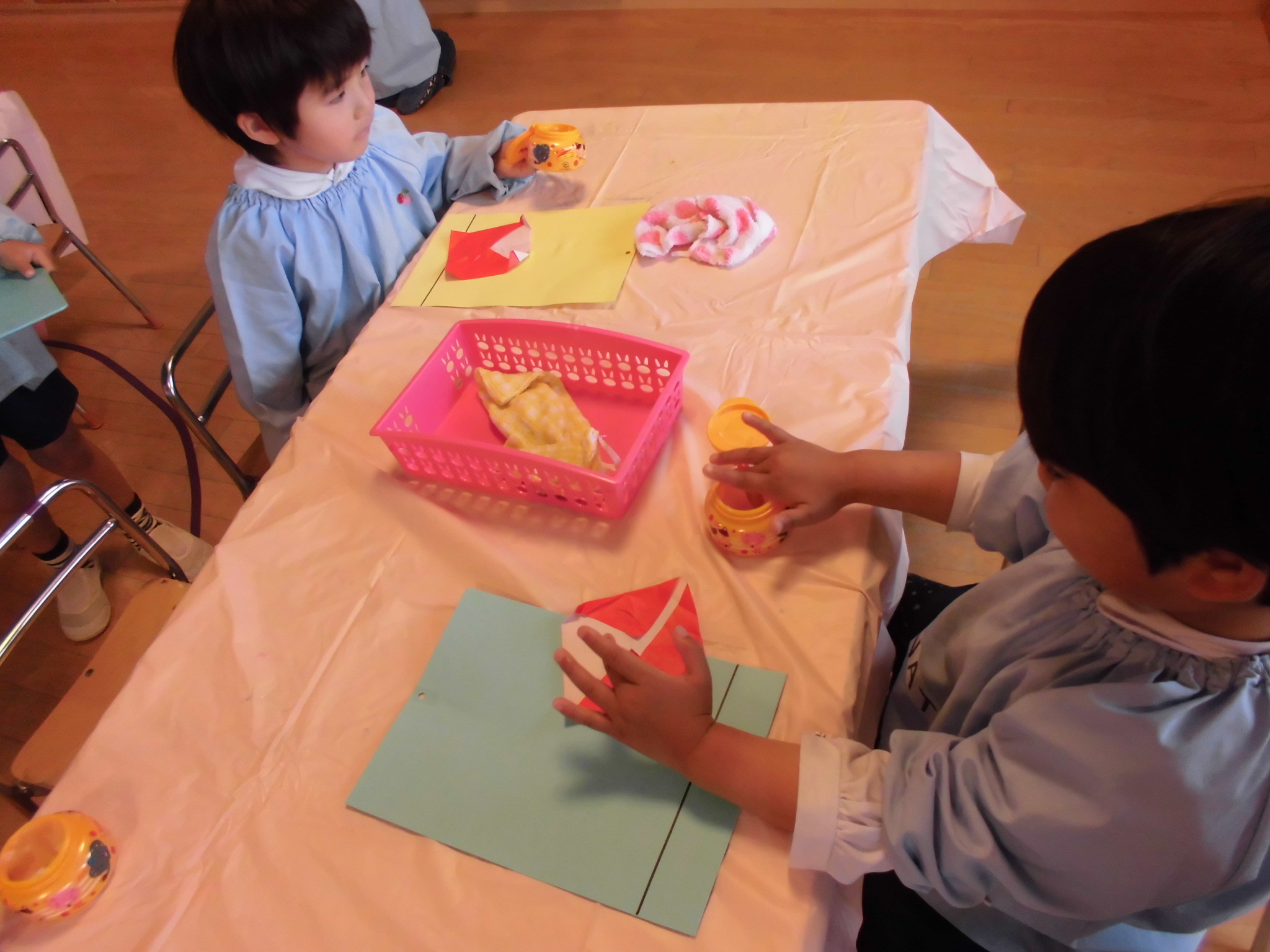 皆で折る中、「おうちみたい」「帽子にも見えるよ」と一枚の紙が様々な形に変身していく面白さを楽しんでいました。「早くお当番さんやりたいな」と当番活動への期待が高まり楽しみにしている様子でした。