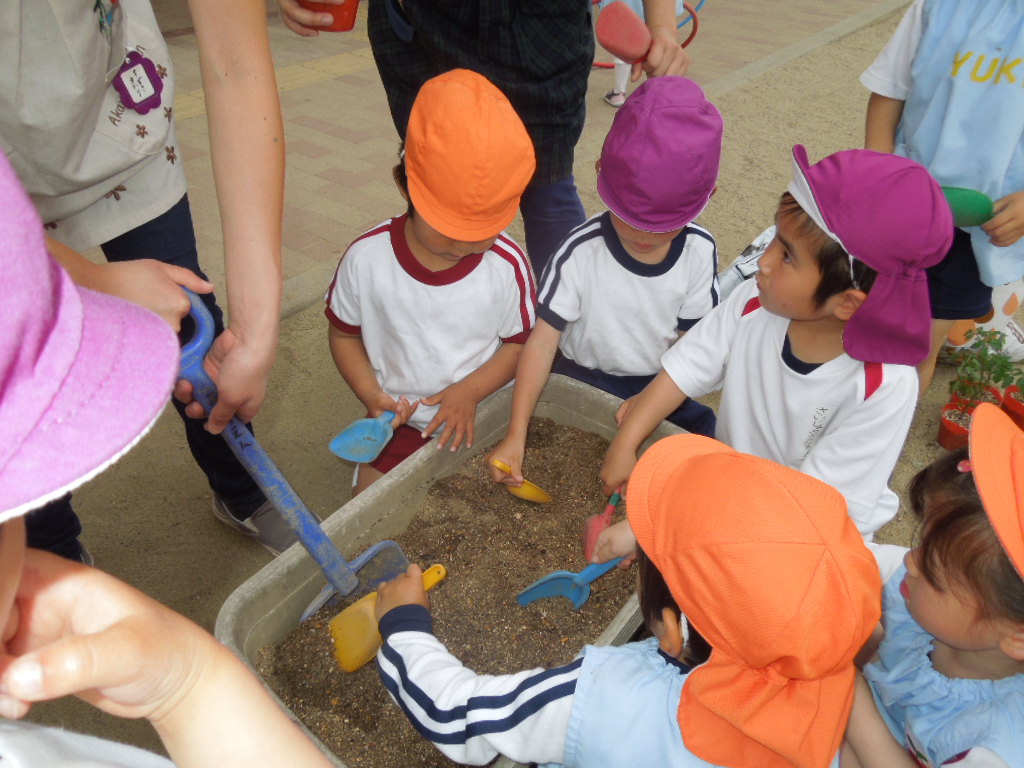 スコップでプランターに土を入れ、肥料を混ぜてそっと苗を植え、「早く大きくなりますように」と、願いを込めて水をあげていました。