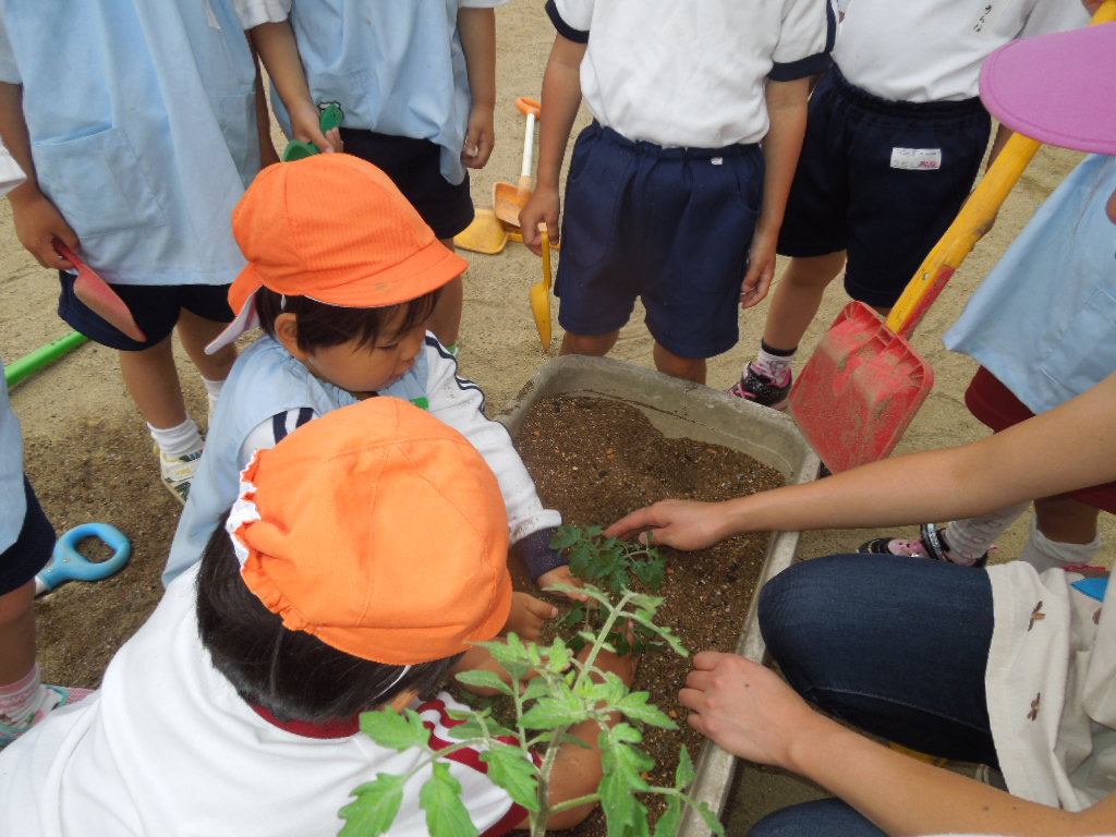「早く食べたいね」「おいしいミニトマトになるといいね」と、ミニトマトの収穫に期待を高めていました。これからもみんなでお世話をしていきます。