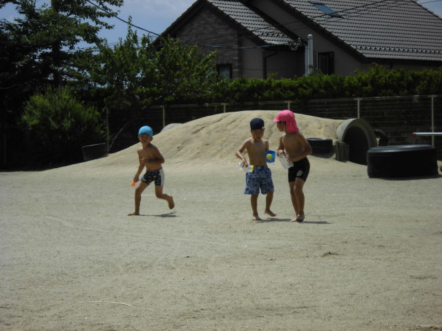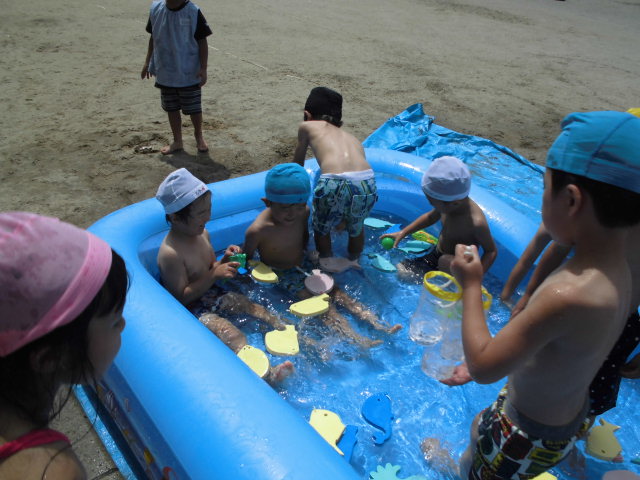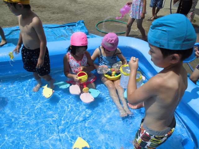 夏休みに入りました。スイングでは、天気の良い日はプール活動を行っています。また、素足で走ったり、泥あそびを楽しんだりと、夏の遊びを全身で楽しんでいます。夏休み中もスイングのお友達は元気いっぱいです。