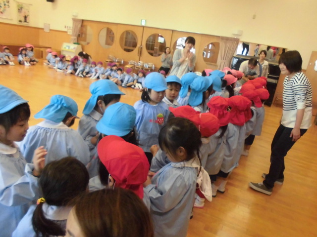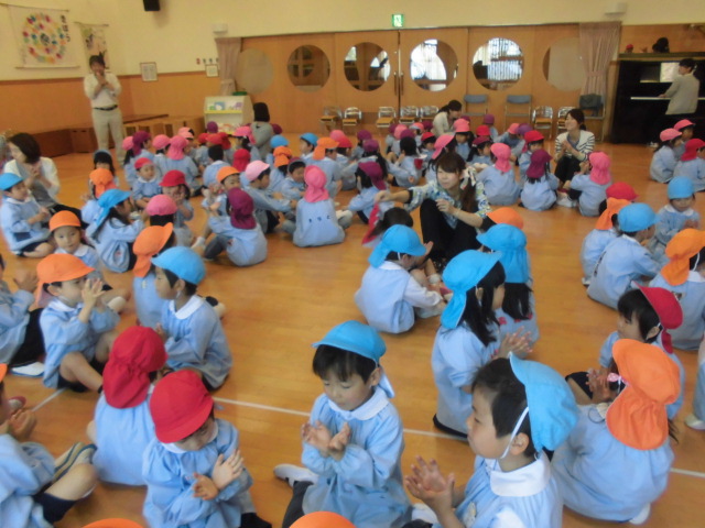 年長組のこどもたちが年少・中組のこどもたちを招待する、「なかよしの会」を行ないました!みんなで園歌やちゅうりっぷを歌ったり、年長組から年少・中組へむけてプラバンのキーホルダーのプレゼントを渡したりしました。この会を通して、縦の繋がりが深まるきっかけになったようです