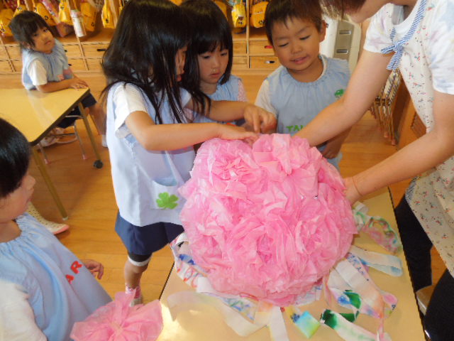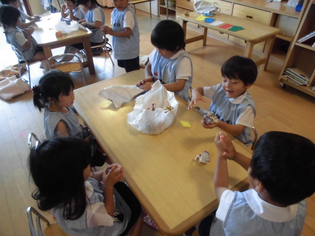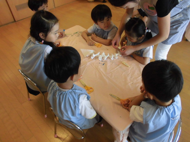 おにいさん、おねえさんが年下の友達に作り方を教えてくれたり、困っている友達がいると助けようとしたりと、異年齢の友達と一緒に楽しんで製作に取り組んでいました。できあがった飾りを見ると、「きれいだね!」「早く飾りたい。」と話し、笹竹に飾ることを楽しみにしていました。