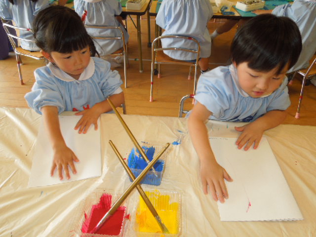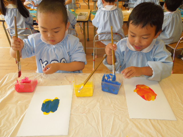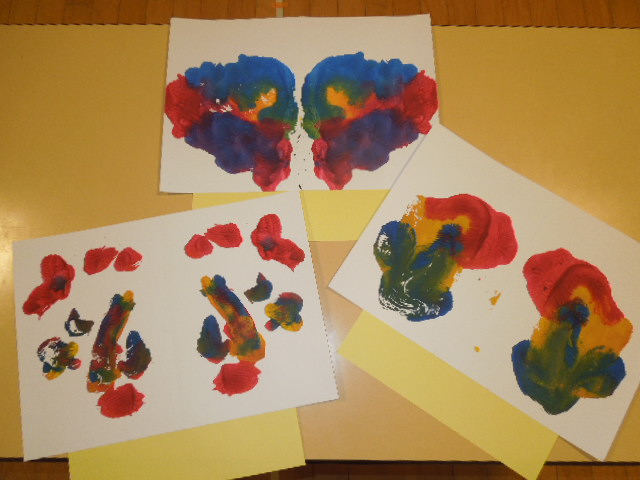 画用紙を半分に折り、片面に赤、黄、青色の絵の具を塗り、その後再び画用紙を半分に折ります。手でゴシゴシこすってみると…いろいろな模様ができました。「うわー、きれい!」と、できた模様を見て喜んだり、「色が混ざってきれいだね!」と友達と作品を見合ったりと、楽しみながら作っていました。