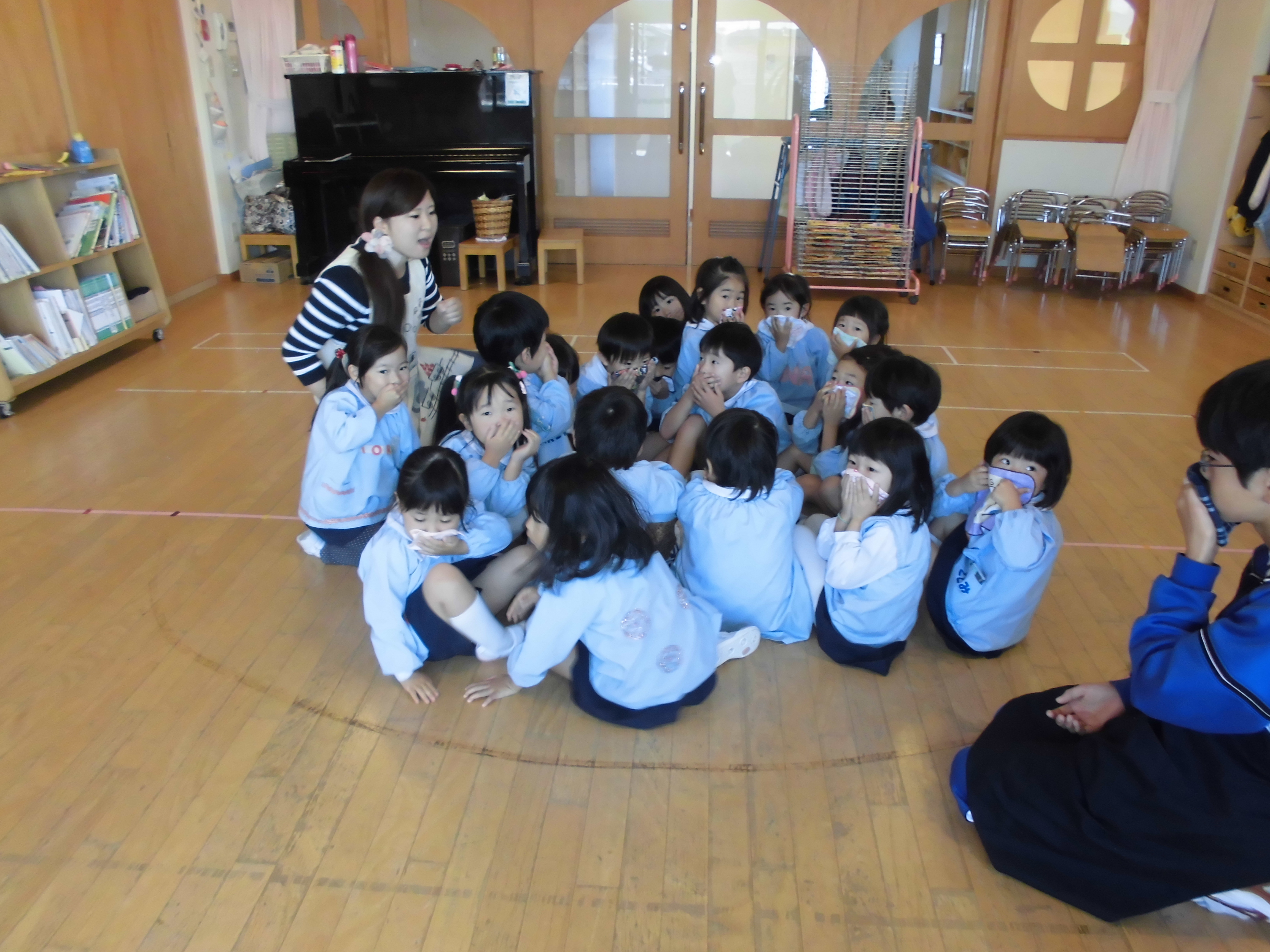 こどもたちは、避難する時の「押さない・走らない・喋らない・戻らない」の約束事を守り、真剣に取り組んでいました。火災避難訓練を通して、安全な避難の仕方を知り、訓練する大切さを感じていました。