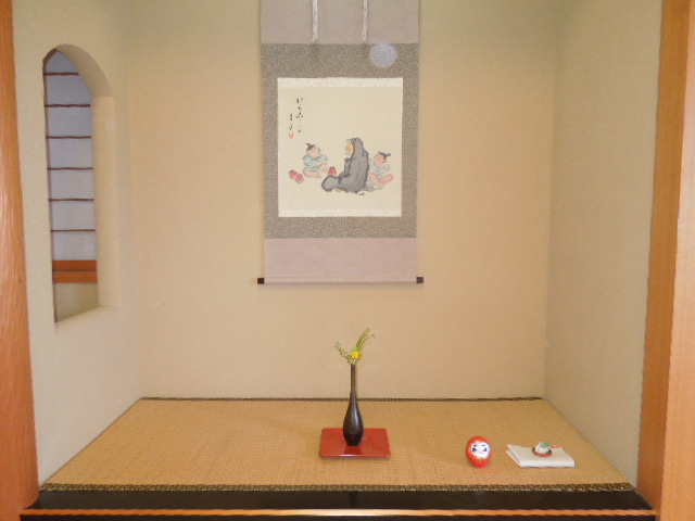 今回のお菓子は「ぽっくり」で、興味深そうに話を聞きながら味わっていました。また、「達磨と童」というお軸の話を聞き、転んでもすぐに起き上がる達磨を真剣な表情で見つめていました。お家の方や先生たちから「とてもおいしかったよ」との言葉をいただくと、とても嬉しそうに微笑んでいました