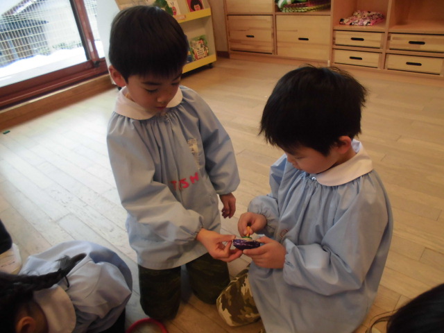今日は鶴ヶ谷幼稚園で「なかよしの会」を行いました。たくさんのこどもたちが独楽を持ち寄り、独楽回しをしました。年少のこどもたちは手回し独楽を使い、年中、年長になるとひもを巻いて独楽を回します。皆で一緒に独楽を回し、「回ったー!」と喜びを共感したり、「僕の独楽を貸してあげるよ」と、年上の友達がひもの巻き方をわかりやすく教えたりと、独楽回しを楽しんでいました!