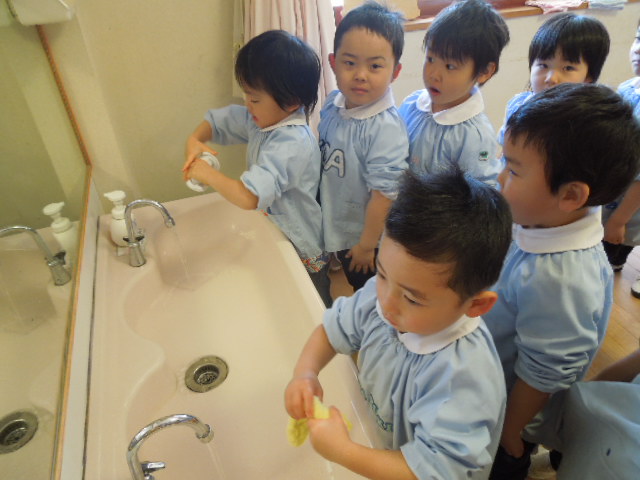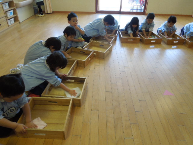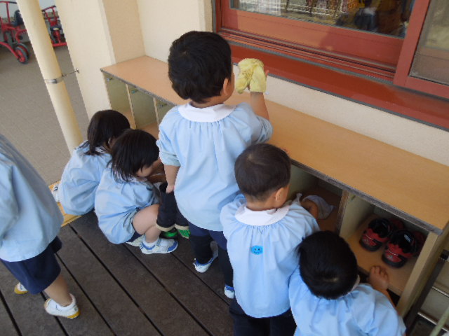 今日は鶴ヶ谷幼稚園の年少組で大掃除をしました。一年間たくさん遊んだお部屋に感謝の気持ちを込めて丁寧に掃除をしました。