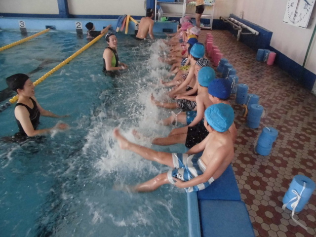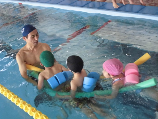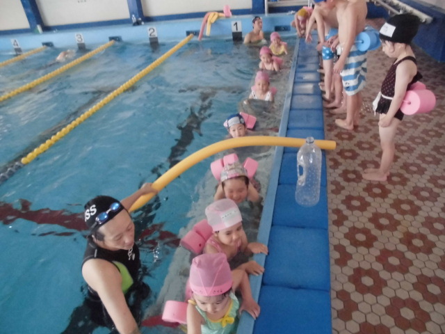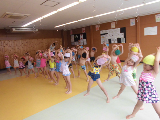 年長組でJSS南光台スイミングスクールに行きました。登園するとすぐに着替えをして、「早く行きたいね!」「どんなことをするんだろう?」と一人ひとりが心待ちにしていたようです。プールに到着すると、コーチの皆さんと元気いっぱい準備体操をして、大はしゃぎでシャワーを浴びていました。水の中に入ると、満面の笑みで「バタ足」や「ワニ泳ぎ」、「自転車こぎ」をして水の感触を味わいながら、身体を動かすことを楽しんでいました。今後もプール活動を通して、水の感触や水あそびの楽しさを味わっていきます。