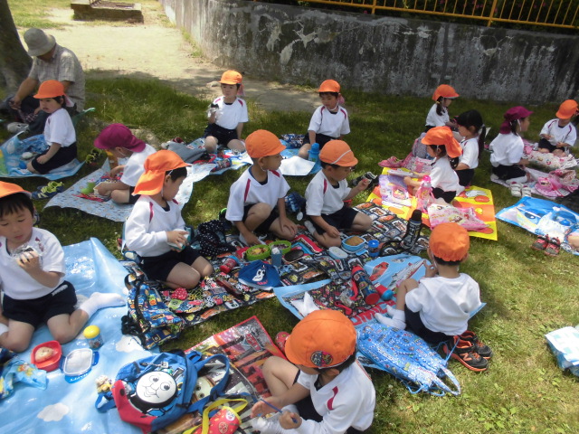 年中組はお昼前に出発し、公園内を散策したり、お弁当を食べたりしました。「四つ葉のクローバーあるかなあ」「どんぐりの木大きいね!」「木の根っこがこんなに伸びてるよ!」とたくさんの発見を楽しんでいました。爽やかな風を感じながら、みんなで食べたお弁当も、格別だったようです!