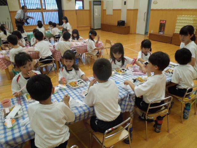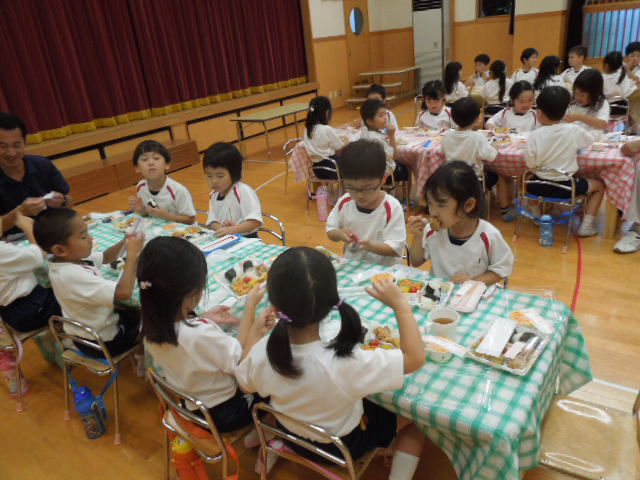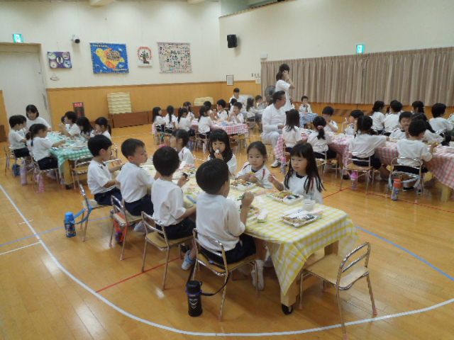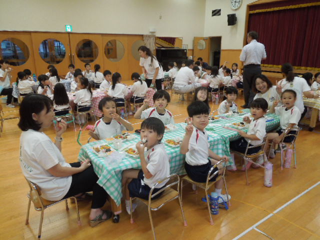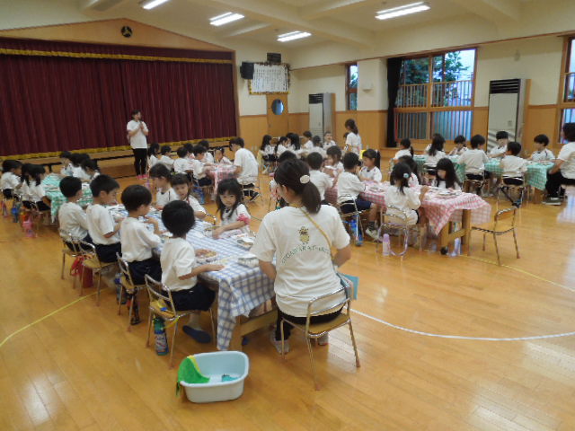 修行を終えた忍者たちは、お腹をすかせてホールに集まってきました!夕食のメニューは、おにぎり、ナポリタン、鶏肉の竜田揚げ、ポテト、トウモロコシ、ミニトマト、ゼリーです。みんなで会話を楽しみながら美味しくいただきました。この後のキャンプファィヤーも楽しみにしている様子です!