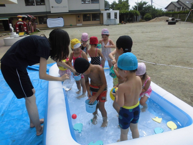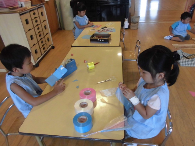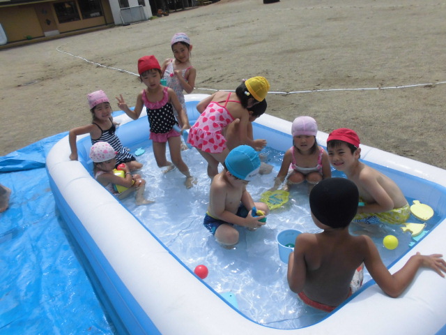 鶴ヶ谷幼稚園のスイングのこどもたちは、暑さにも負けず、元気いっぱいです。今日もみんなで仲良くプールあそびを楽しみました。室内では画用紙やスズラン テープを使った製作遊びも盛り上がり、積木やおままごとなど、いろいろな学年、クラスの友達と一緒にアイディアを出し合いながら遊んでいました。「早くみんな幼稚園に来ないかな?」と、始業式の日を楽しみにしています。