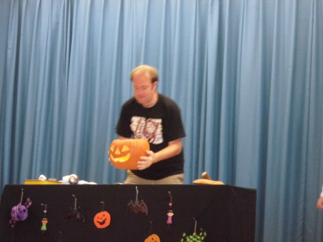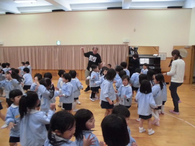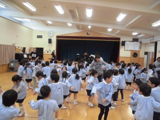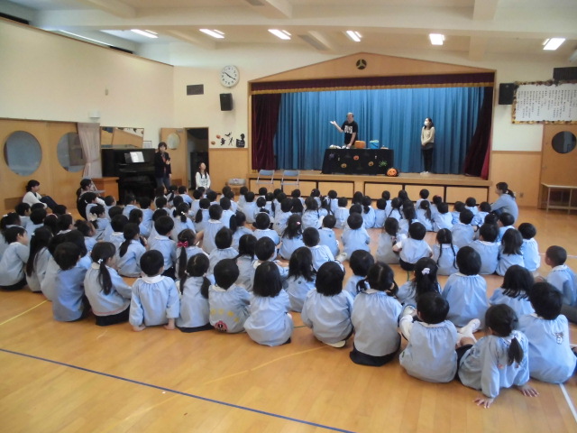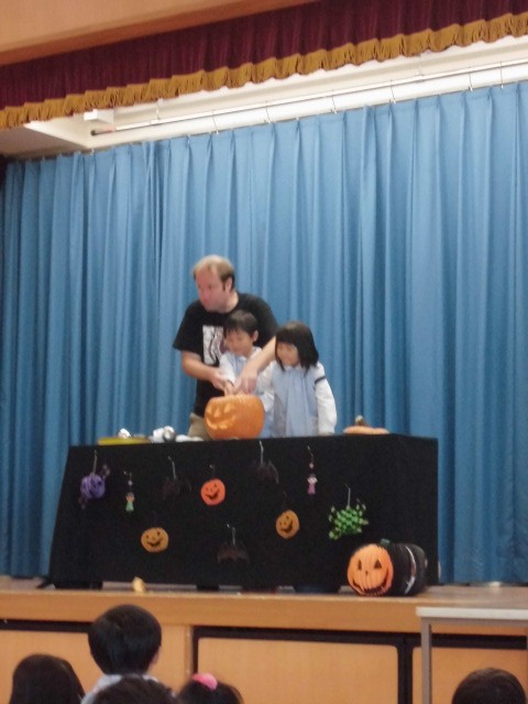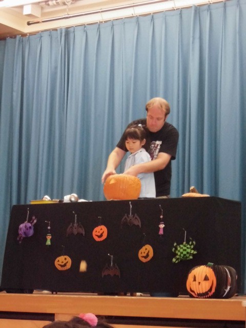 今日は異文化体験活動でジャック・オ・ランタン作りをしました!会の初めにハロウィンの由来を教えてもらったことで、ランタンへの関心もより深まっていました。マイク先生がかぼちゃを切っている際、こどもたちは「GO!GO!GO!マイク先生GO!」と応援しながら、ワクワクした様子で見ていました。顔の部分をくり抜く時は、こどもたちにも手伝ってもらい、「PUSH!」と声をかけながら行ないました。完成した“ジャック・オ・ランタン”を見て「すごーい!」「マイク先生ありがとう!」と喜んでいました。最後は皆で『Halloween Night』を元気いっぱい踊りました!来週行う収穫祭でもハロウィンの雰囲気を味わいながら楽しんでいきます!