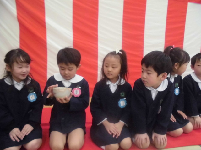 お菓子は、『麩焼せんべい』でした。波に日の出と、松のおめでたい絵が描かれているお菓子をいただきました。また、今回は友達と一つの茶碗でお茶を飲むという『大福茶』をいただき、皆で幸せを分け合いました。こどもたちは、茶道具について話を聞き、保育室に戻ってからも「お茶碗がきれいだったね」「羽子板も素敵だったよね」と話し、初釜を振り返っていました。また、茶会の雰囲気を味わい、とても充実した時間となったようです。