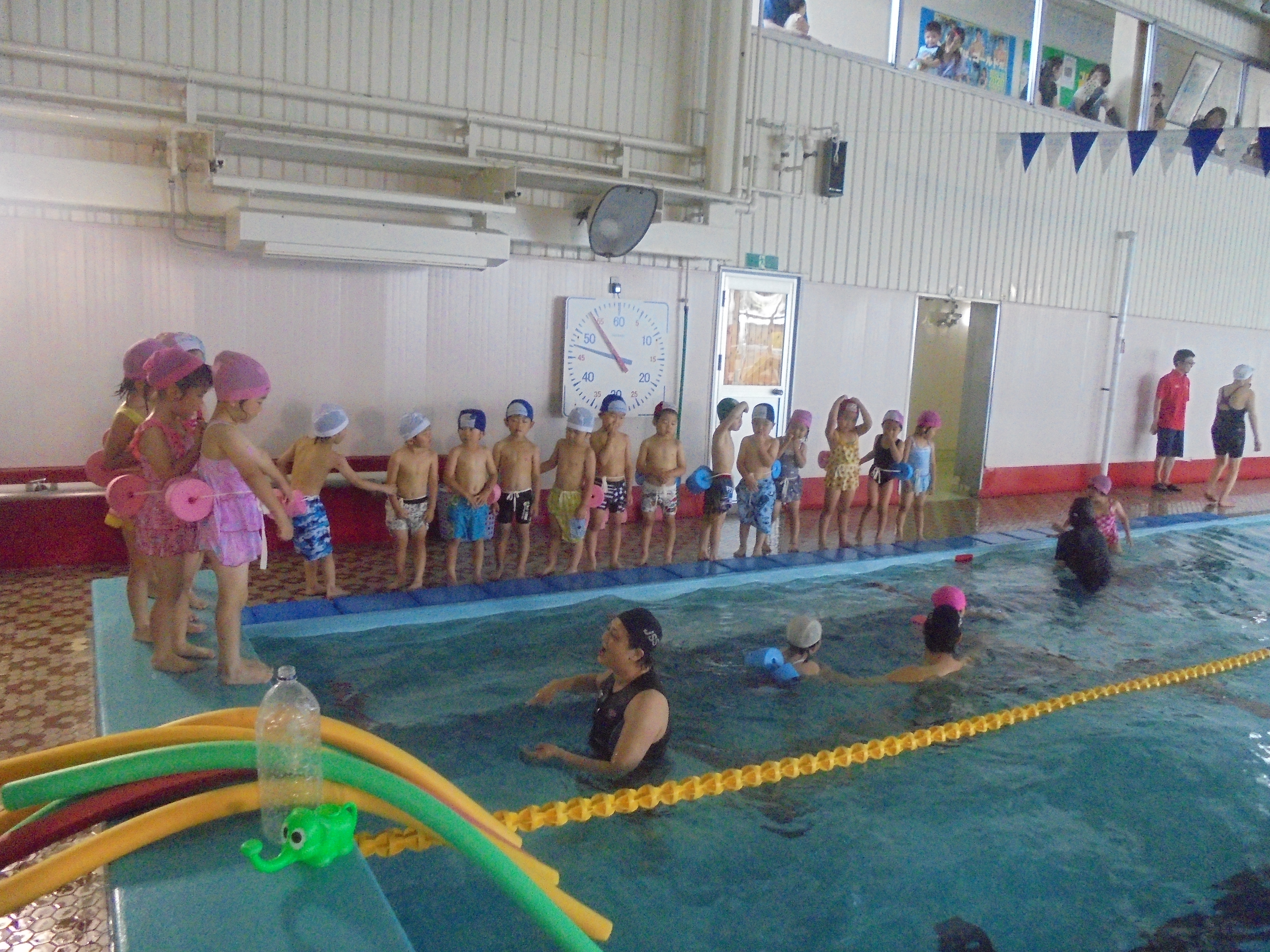 鶴ヶ谷幼稚園の年中組では、JJSで最後のプール活動を行いました。毎回プールに入ることを楽しみにしていたこどもたちは、「水の中って気持ちがいいね!」「顔をつけられるようになったよ!」と、水に親しみました。1、2回目のカニ歩きやワニ歩き、自転車こぎに加え、今日はジャンプでプールに入ることに挑戦しました。ドキドキしながらコーチに向かってジャンプをすると、豪快な水しぶきとともに「できたよ!!」と満足そうな笑顔が見られました。こどもたちは、3回のJSSでのプール活動で水あそびが大好きになりました。また、挑戦することで達成感を味わい、自信にもつながったようです。今後は、大好きになった水あそびを幼稚園のプールで楽しんでいきます。