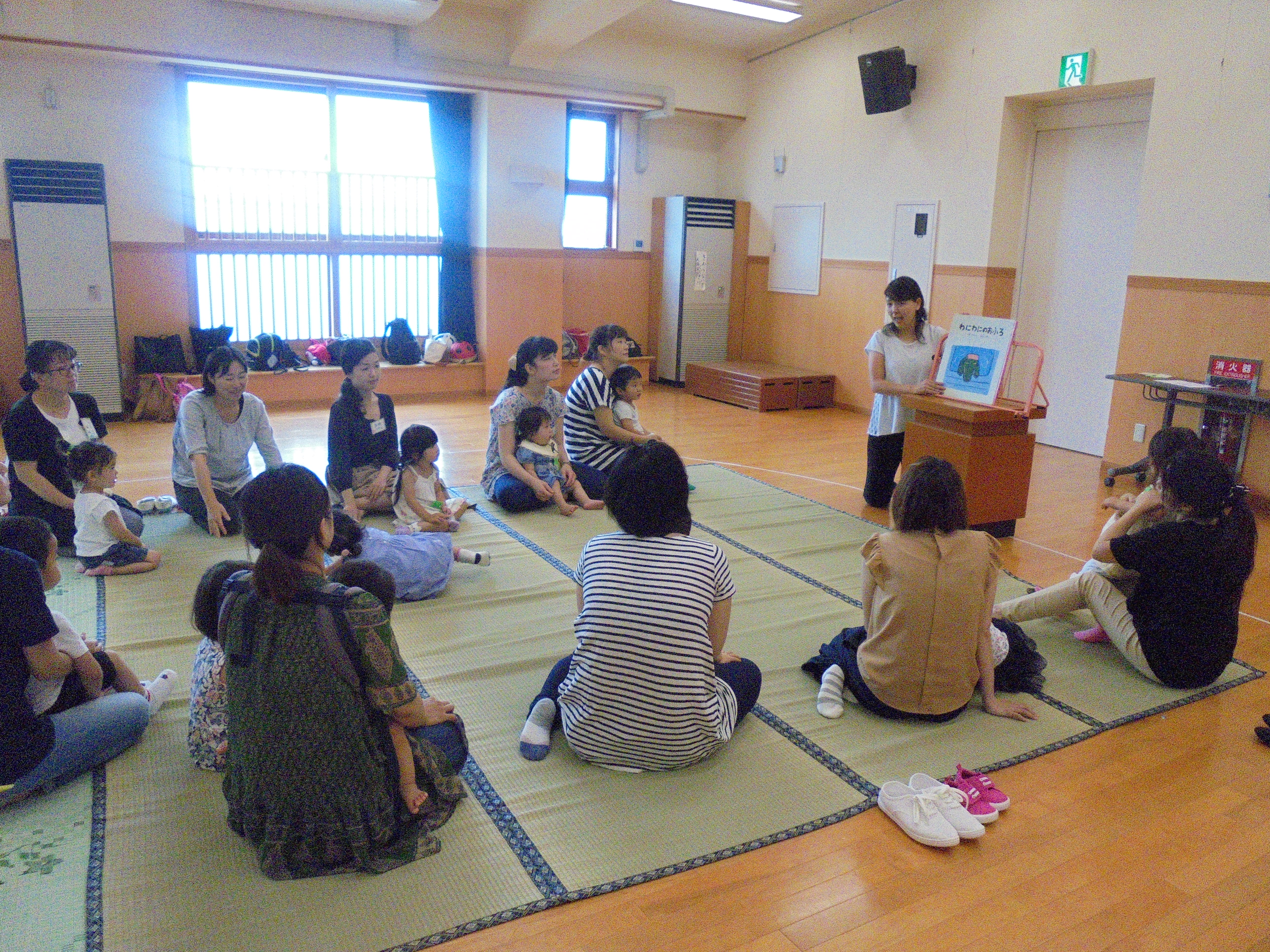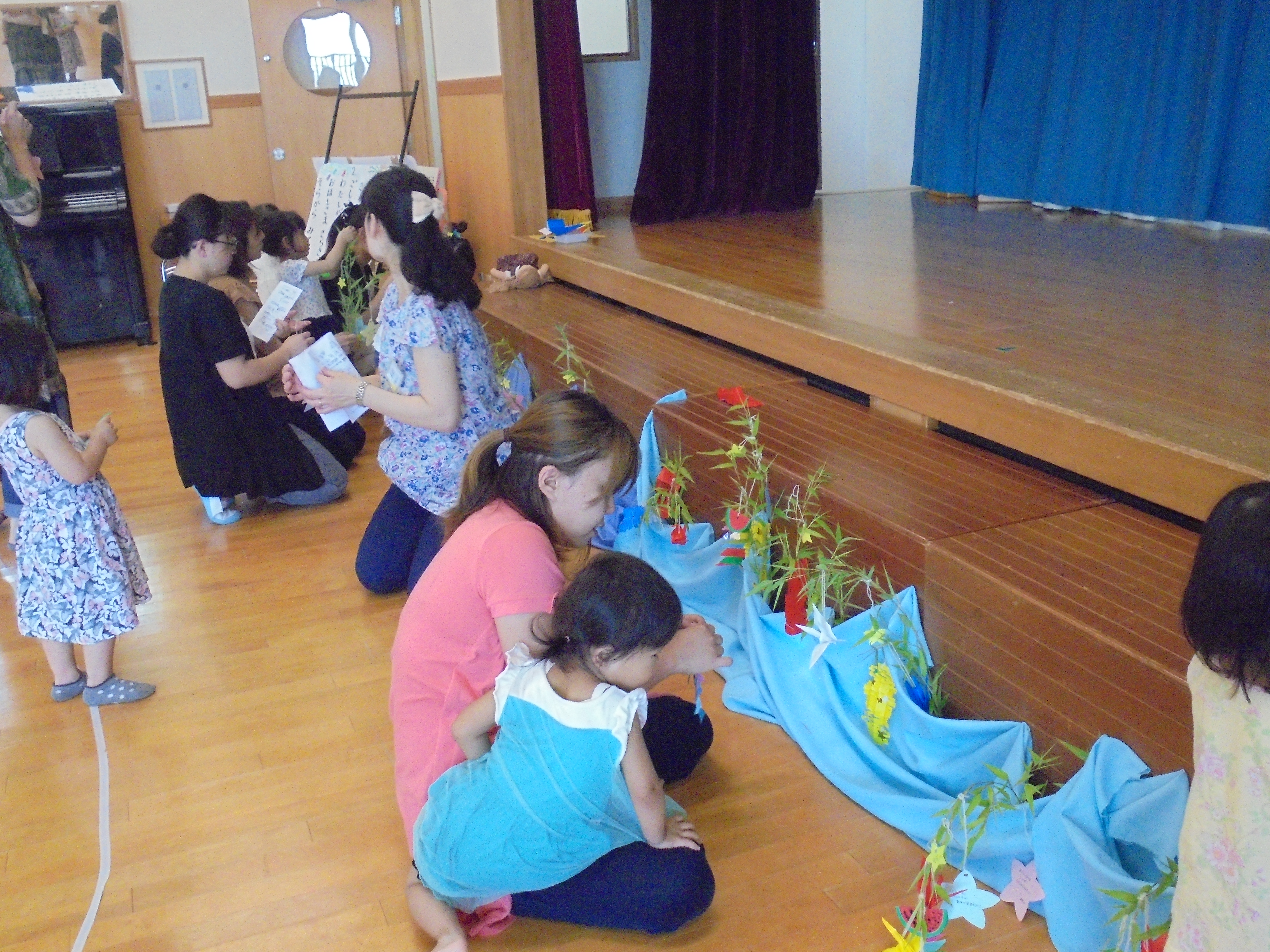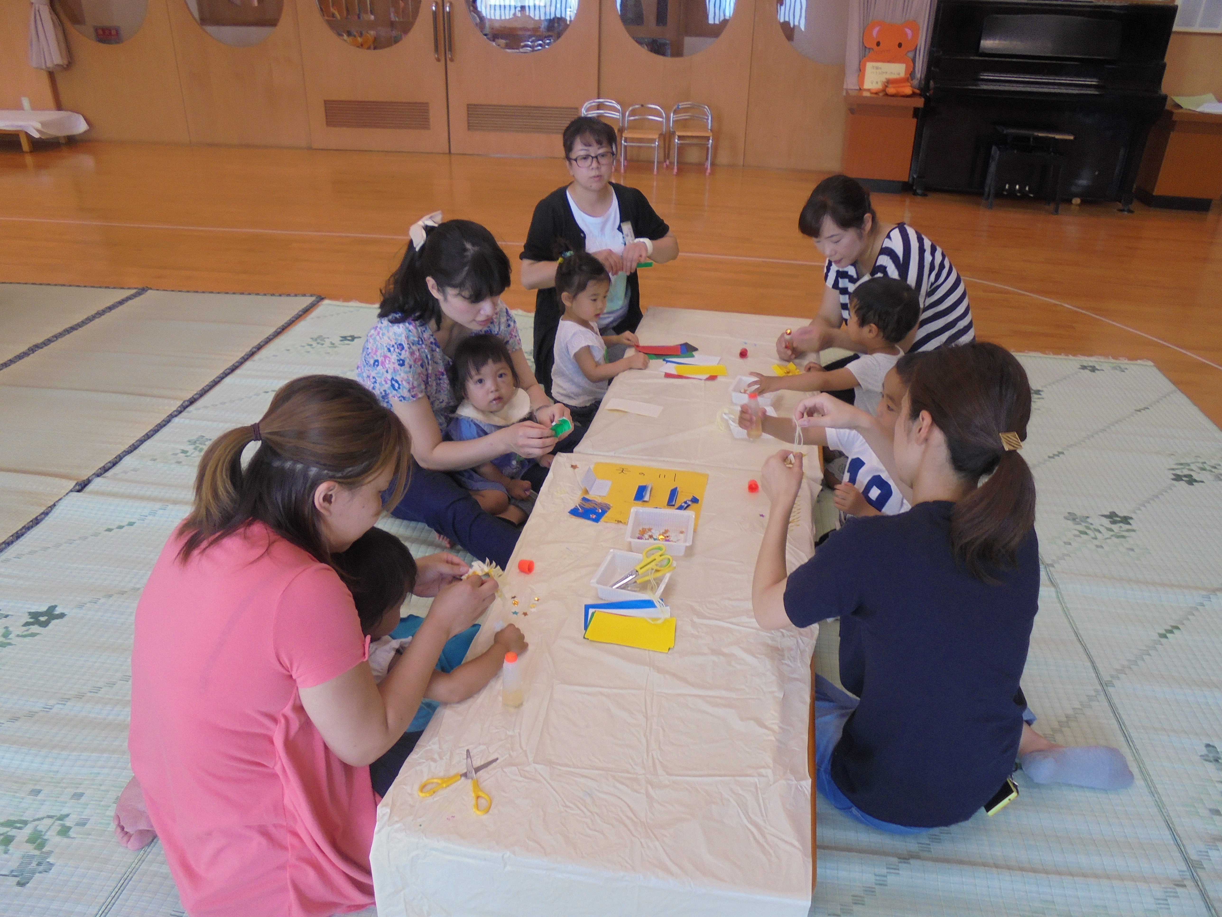 今回は七夕製作を行いました。みんなで三角つなぎを作ったり、短冊に願い事を書いたりしました。「ここはわたしね!」「ここはママ手伝ってね!」と、親子で協力しながら完成させていました。最後にはみんなの願いが空まで届くようにと、完成した笹竹を皆で眺めながら「たなばたさま」のうたを歌いました。次回は、9月7日木曜日です。園庭で体操をしたり、かけっこをしたりします!