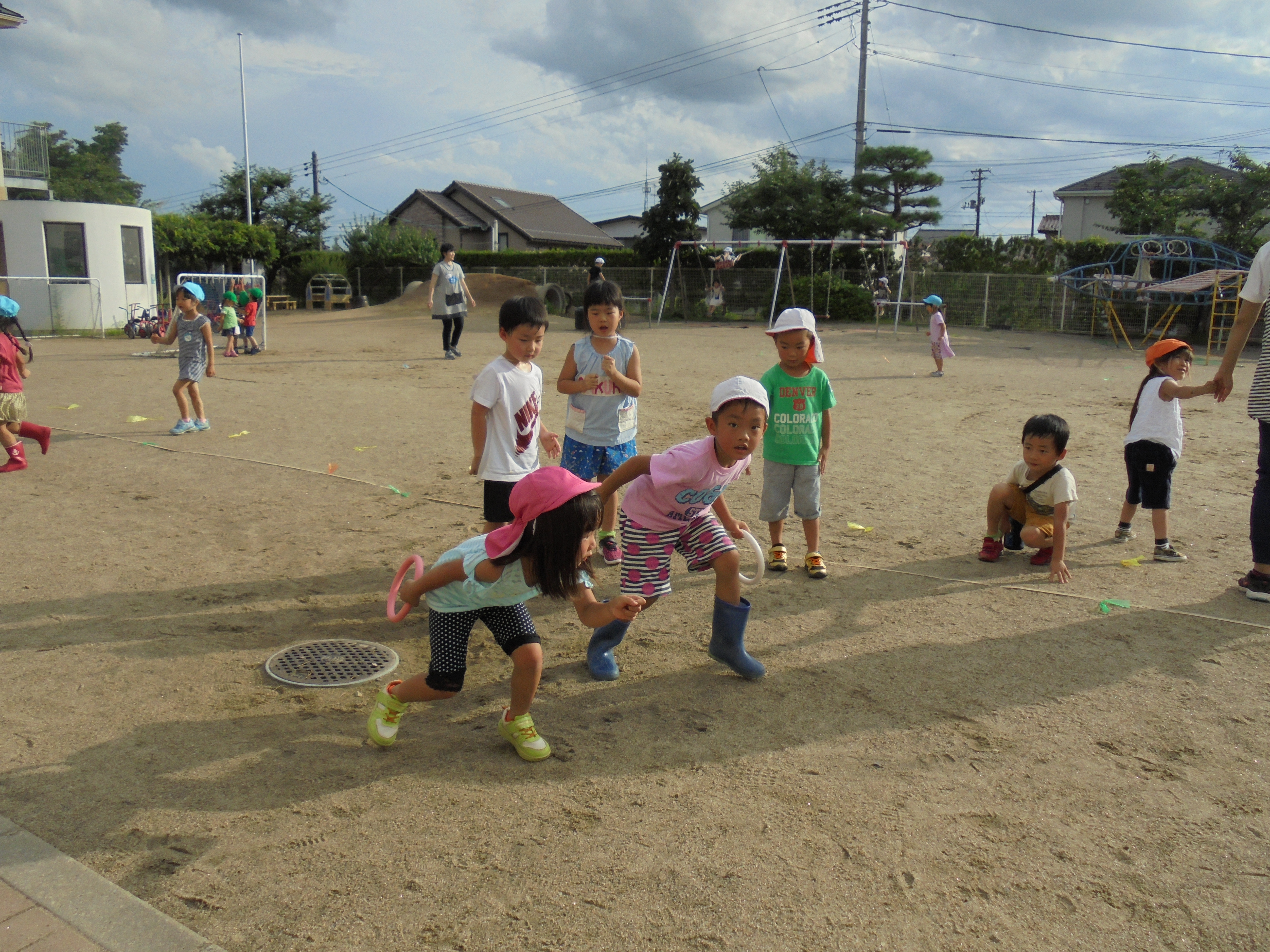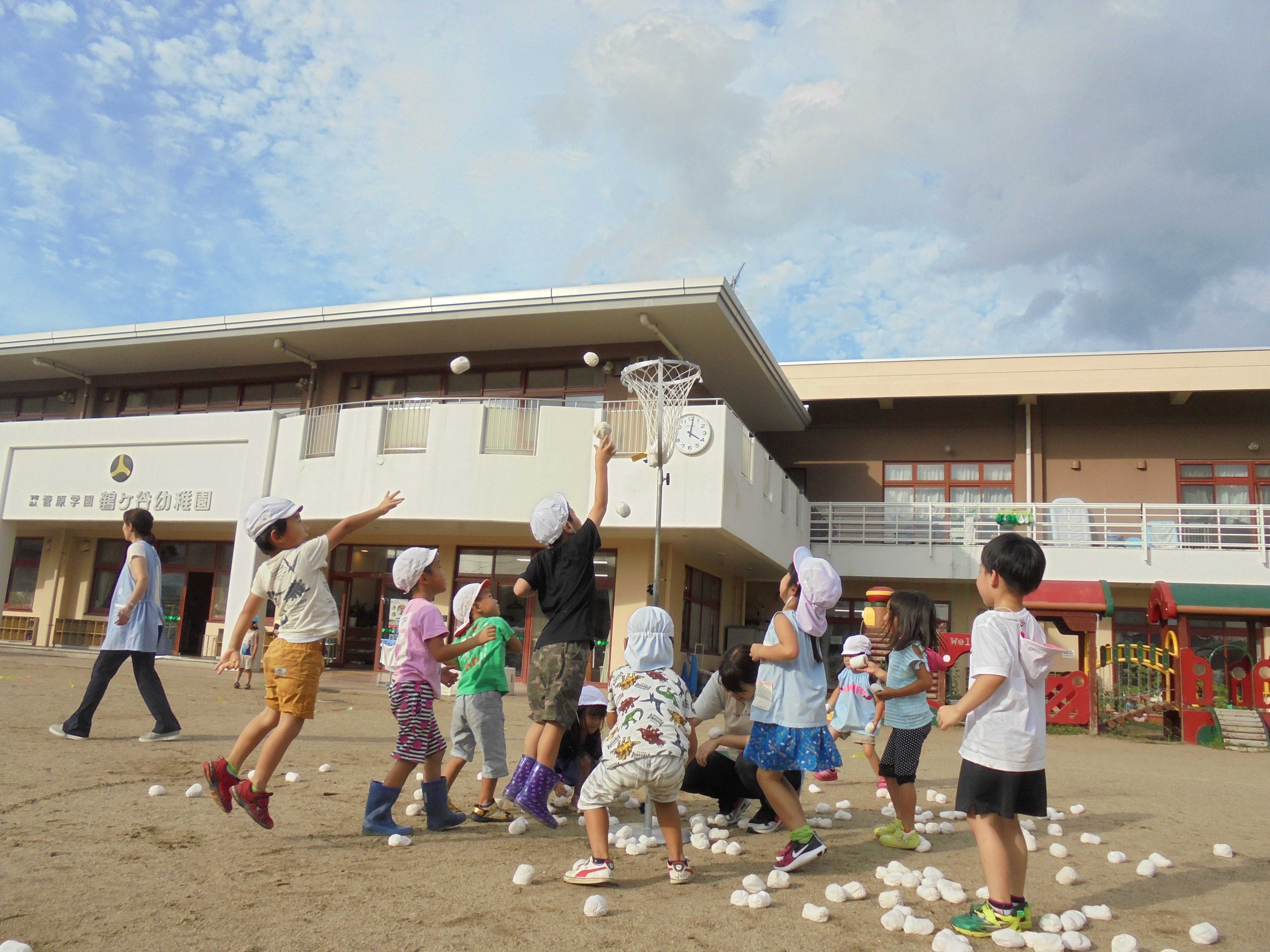 今年の夏は雨が降り続きましたが、夏休み最終日の今日は、太陽が顔をだし、暑い1日となりました。鶴ケ谷幼稚園では、スイングのこどもたちがリレーや玉入れの運動会ごっこをして、異年齢でのかかわりを楽しみました。身体をたくさん動かして遊び、笑い声を園庭いっぱいに響かせました。