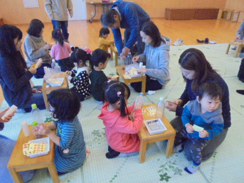 今日の鶴ヶ谷幼稚園未就園児ハミングサークルでは、前回県民の森で拾ってきたどんぐりを使ってマラカスを作りました。自分で拾ってきたどんぐりを丁寧にペットボトルの中に入れたり、ビニールテープを貼るお母さんを応援したりと、親子で協力しながら製作に取り組んでいました。最後に皆で完成したマラカスで「♪山の音楽家」のうたに合わせて演奏を楽しみました。次回は12月14日(木)クリスマス会をする予定です?