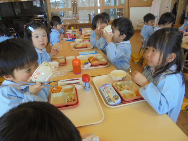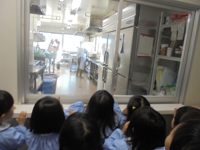 マードレ保育園にある給食室に見学に行きました。大きな冷蔵庫やたくさんの食材に驚いたこどもたちは、調理をしている方たちを見て「みんなの分の給食を作るって大変なんだね」と気付いたようです。いつもよりさらに感謝の気持ちをもって給食をいただいていました。
