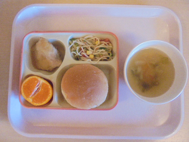 今日のメニューは、プチパン、かじきのバーベキューソースがけ、トマトときゅうりのサラダスパゲティ、野菜スープ、みかんでした。今学期最後の給食も、おいしくいただきました。