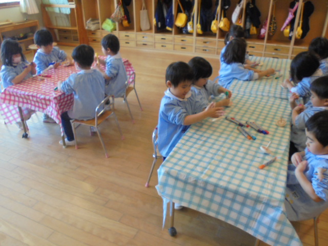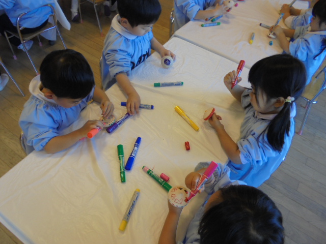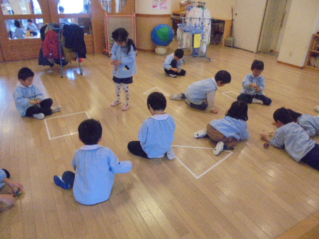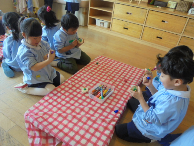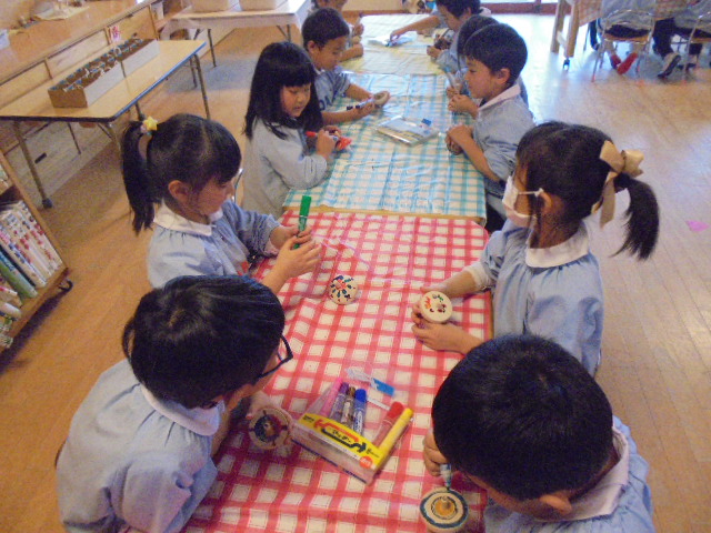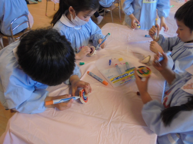 鶴ヶ谷幼稚園では、お正月あそびの2つとして独楽回しが盛り上がっています。各学年毎に年齢にあった木の素材の独楽を、一人ひとりが自分だけのものとして大切にしながら回すことに挑戦しています。大切な独楽に色を塗るとますます愛着がわいた様子で、「世界で一つだけの独楽になったね!」と独楽回しがもっと楽しくなったようです。また、色を付けた独楽を回しながら「回ると色が混ざるんだね!」「輪っかの模様がでてきたよ!」と回した時の色の変化にも興味をもちながら遊んでいました。今後も昔ながらのあそびの楽しさを感じながら独楽回しに挑戦し、楽しんでいきます。