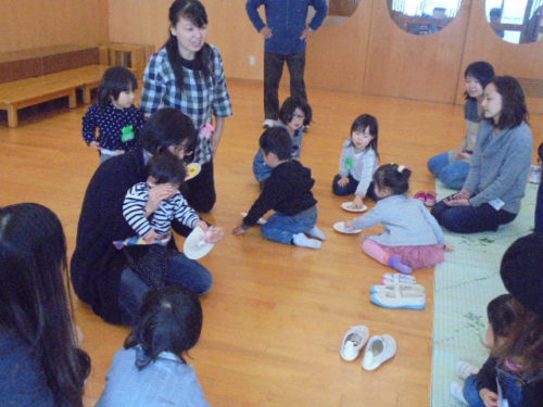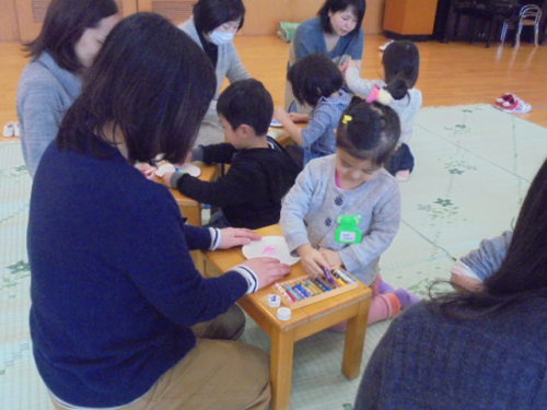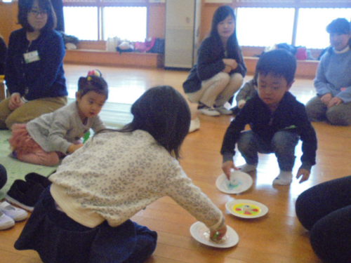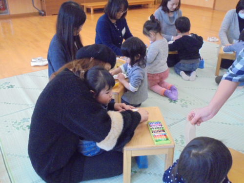 今年初めてのハミングサークルで、親子でコマを作って遊びました。