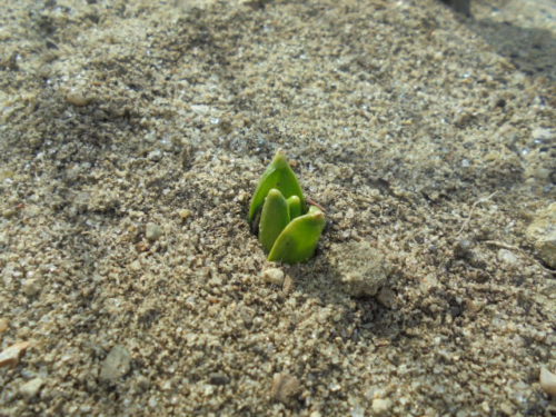 まだまだ風の冷たい日が続いていますが、日差しに暖かさを感じる日も増えてきました。園門から続く花壇には、年少中組のこどもたちが植えたちゅうりっぷの球根が土の中で春を待ちわびています。暖かな日差しに誘われて、少しずつ顔を出し始めた球根もあります。何色の花が咲くのか、こどもたちと共に観察していきます。