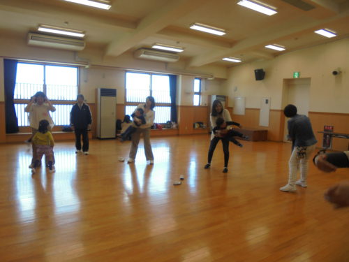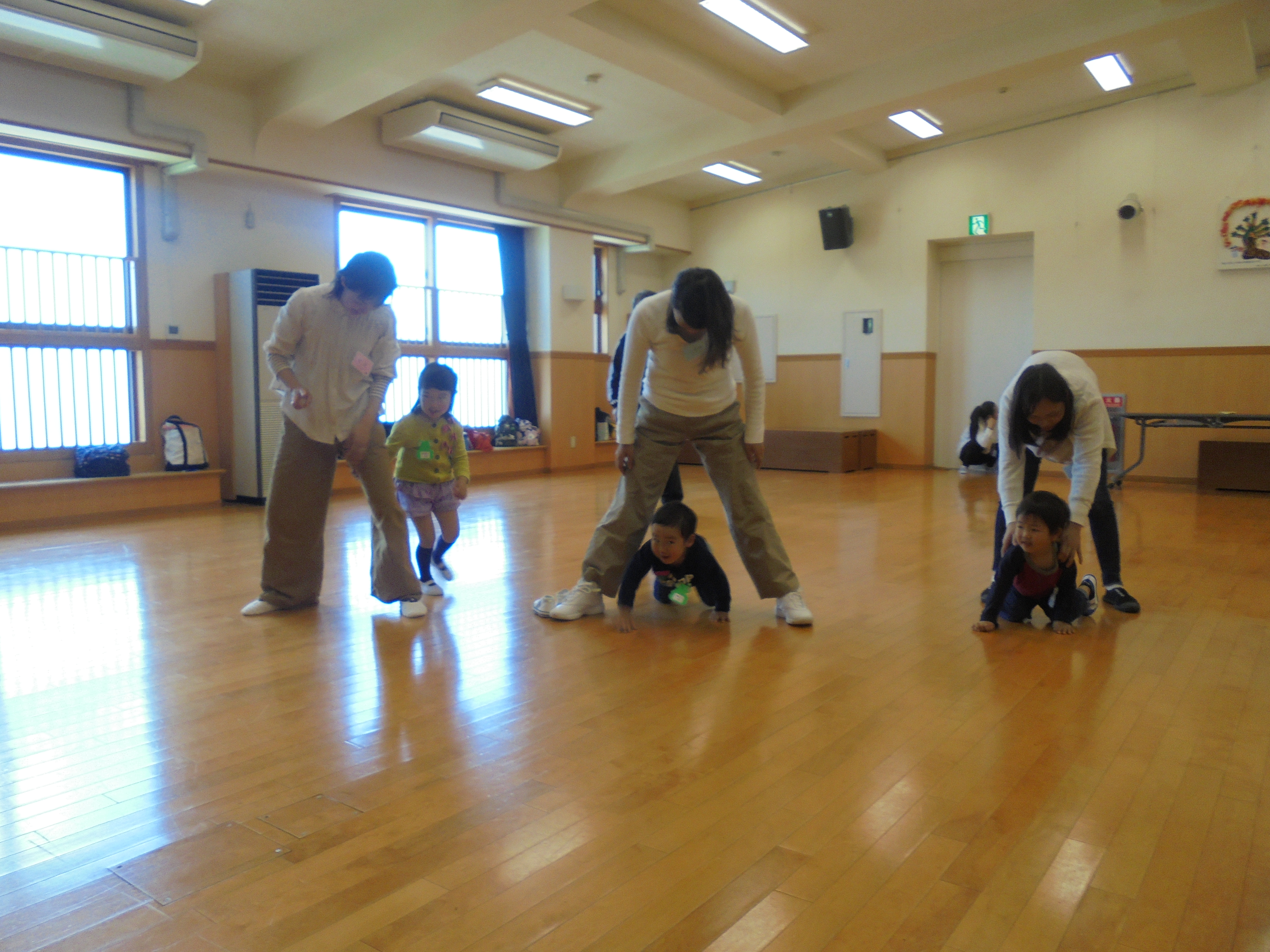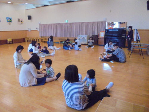 少し緊張しながら登園して来たこどもたちでしたが、スポンジブロックを積み上げたり、ままごとをしたりと楽しく過ごしました。親子での触れ合いあそびでは、「あわあわシャワシャワ」や「きゅうりができた」、「おふねはぎっちらこ」を皆で楽しみました。いろいろトンネルでは、お母さんの腕や足で作ったトンネルを何度もくぐったり、コアラだっこや、ゆらゆらブランコをしてもらいました。こどもたちの表情も笑顔いっぱいになりました。次回は5月10日(木)です。今後の活動も親子の触れ合いを存分に楽しめるようにしていきます。