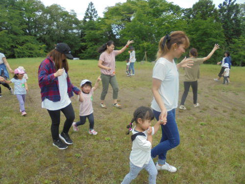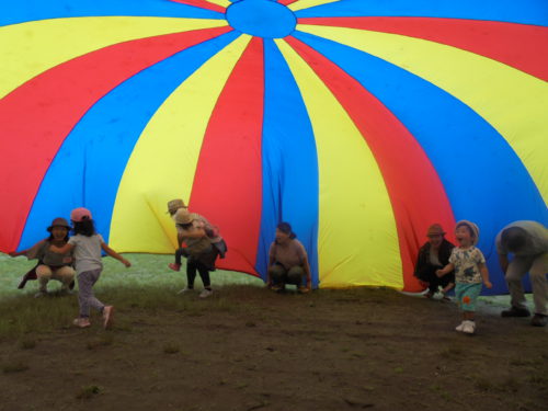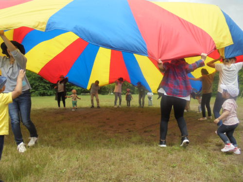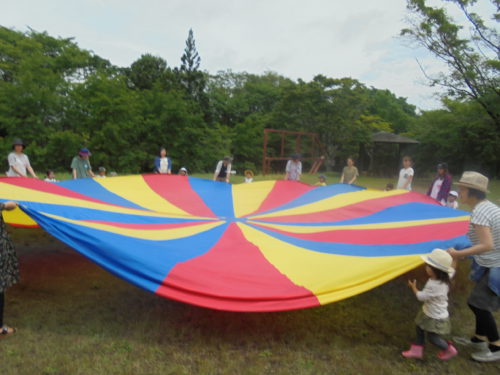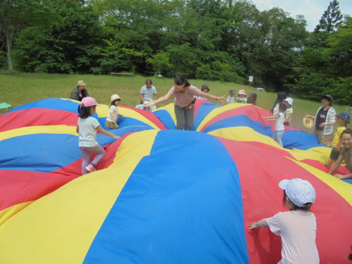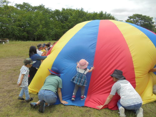 緑いっぱいの県民の森では、「フルフルフルーツ」の体操をしたり、大きな大きなバルーンで遊んだりと、みんなで楽しんできました。