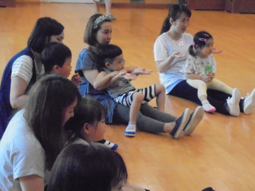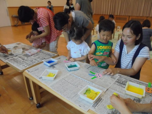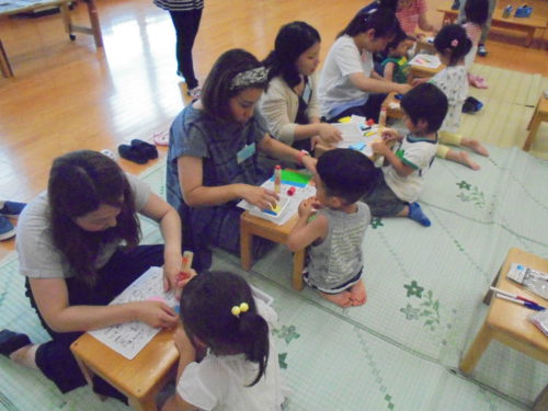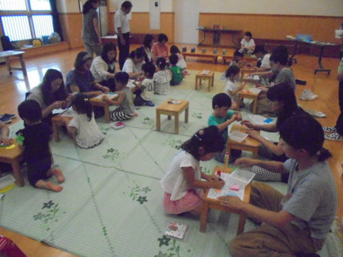 鶴ヶ谷幼稚園の1学期最後のハミングサークルでした。七夕が近いということもあり、皆で「織姫」「彦星」や、「吹き流し」を作りました。絵の具で指スタンプをして模様をつけたり、色とりどりの画用紙の中から、織姫、彦星の着物を親子で相談しながら選んだりと、一緒に製作を楽しみました。