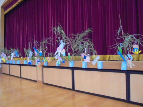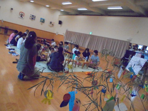 おやつの後には、完成した飾りや、願い事を書いた短冊を飾った笹竹を眺めながら「♪たなばたさま」のうたを歌いました。