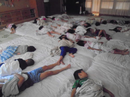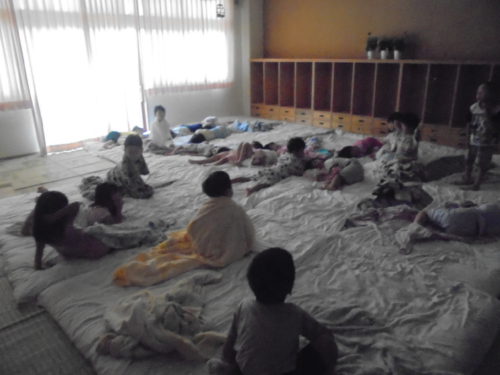 鶴ヶ谷幼稚園お泊まり会2日目の朝です(5時30分)。起床時間前ですが、こどもたちは少しずつ起き始めました。もう少しで「朝のつどい」が始まります!