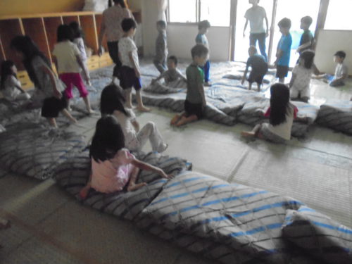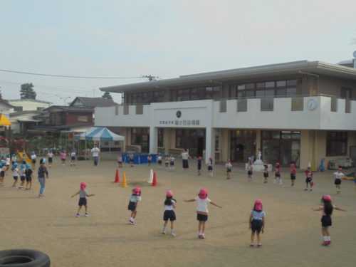元気いっぱい目覚めたこどもたちは、「もっとお泊まりしたいね!」、「楽しかったね♪」と話しながら友達と協力してシーツをたたんだり、布団を運んだりしました。朝のつどいでは、園庭でラジオ体操をし、4丁目公園まで散策にでかけました。