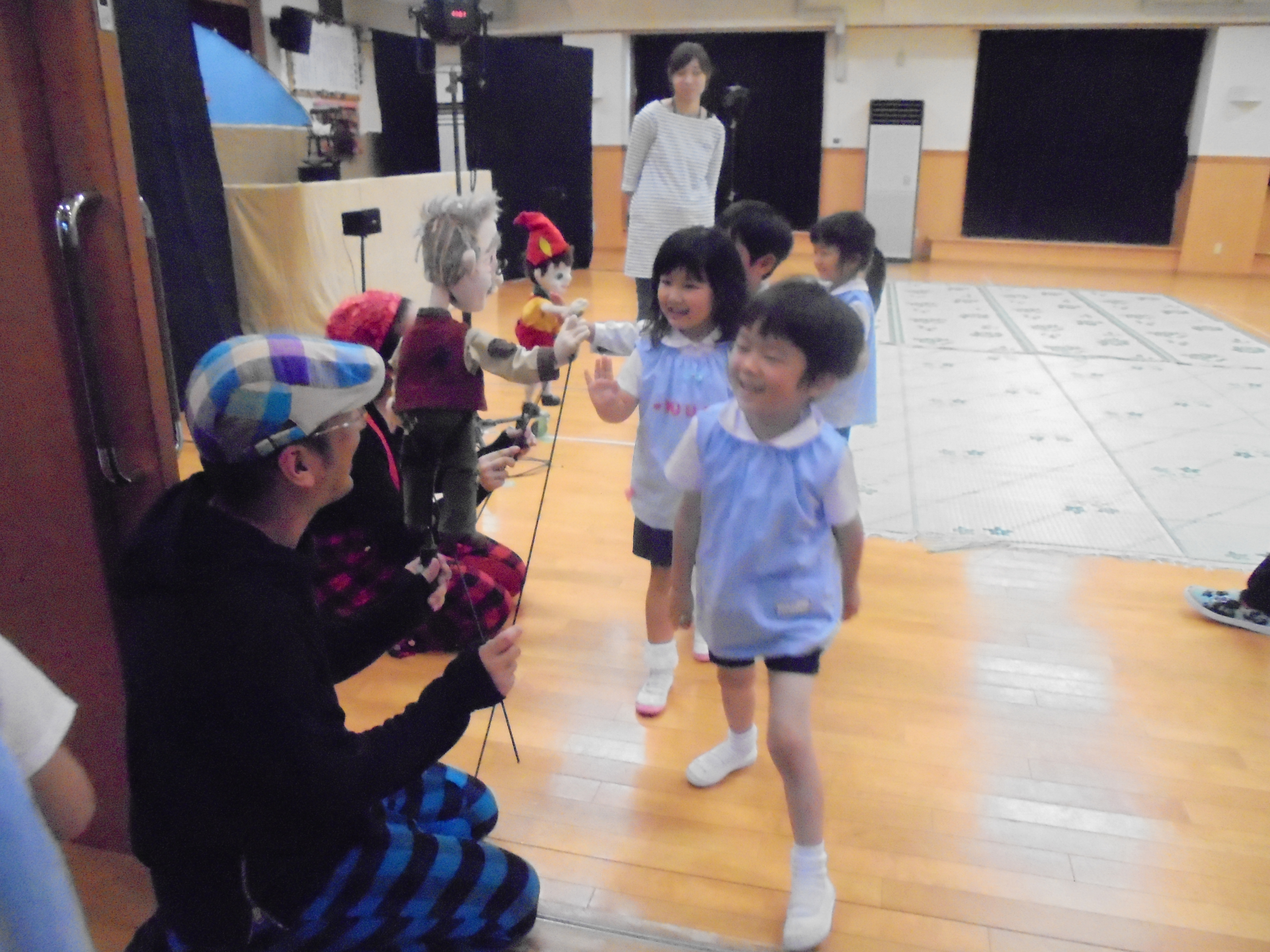 鶴ヶ谷幼稚園では『劇団 貝の火』さんをお招きして『しちひきのこやぎ』『ピノッキオのぼうけん』の人形劇を鑑賞しました。次々と変わる場面や愉快な人形の動きにこどもたちは真剣に見入っていました。また、うたに合わせて手拍子をしたり、時には笑い声が聞こえたりして人形劇を十分に楽しんでいたようです。終わってからは「おもしろかったね!」と友達や先生と話が盛り上がっていました。これからも活動を通して表現することの楽しさを伝えていきます。