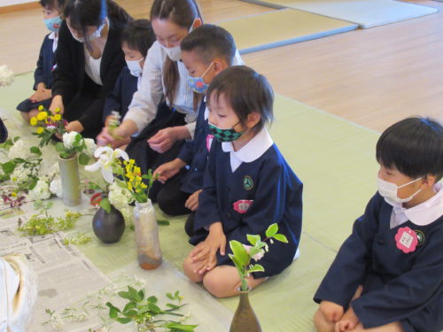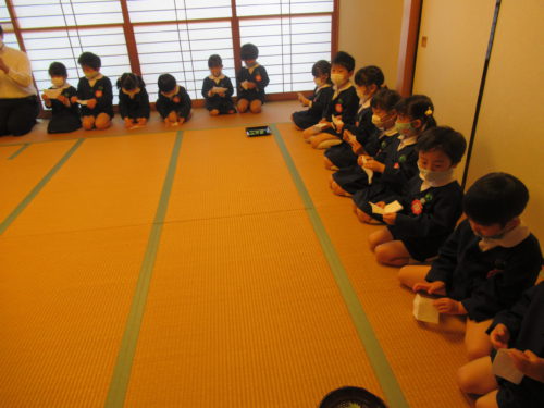 鶴ヶ谷幼稚園の年長組では、茶道の時間を行ないました。今月のお軸、「鯉の滝のぼり」の話やお菓子やお茶のいただき方についての話を聞きました。お菓子をいただく時には、「お先に」と「どうぞ」のあいさつについて聞いた子どもたちは、丁寧にあいさつをし味わってお菓子をいただいていました。また、お皿や茶碗をさげていただく時はお辞儀をしたり、「ごちそうさまでした」と答えたりすると嬉しい気持ちになるという話を聞いて、茶道から思いやりの気持ちを知ることができました。今後も茶道を通してこどもたちが様々なことを感じていけるような時間にしていきます。