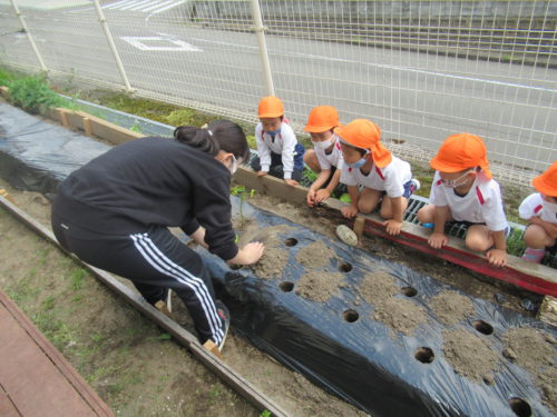 今日は鶴ヶ谷幼稚園の畑に、さつまいもの苗を植えました。苗を見たこどもたちは、「細長いね」「これがおいもになるの?」などと興味津々な様子でした。先生が植える様子を真剣に見て、「どんどん大きくなってほしいね」とこれからのさつまいもの生長を楽しみにしていました。