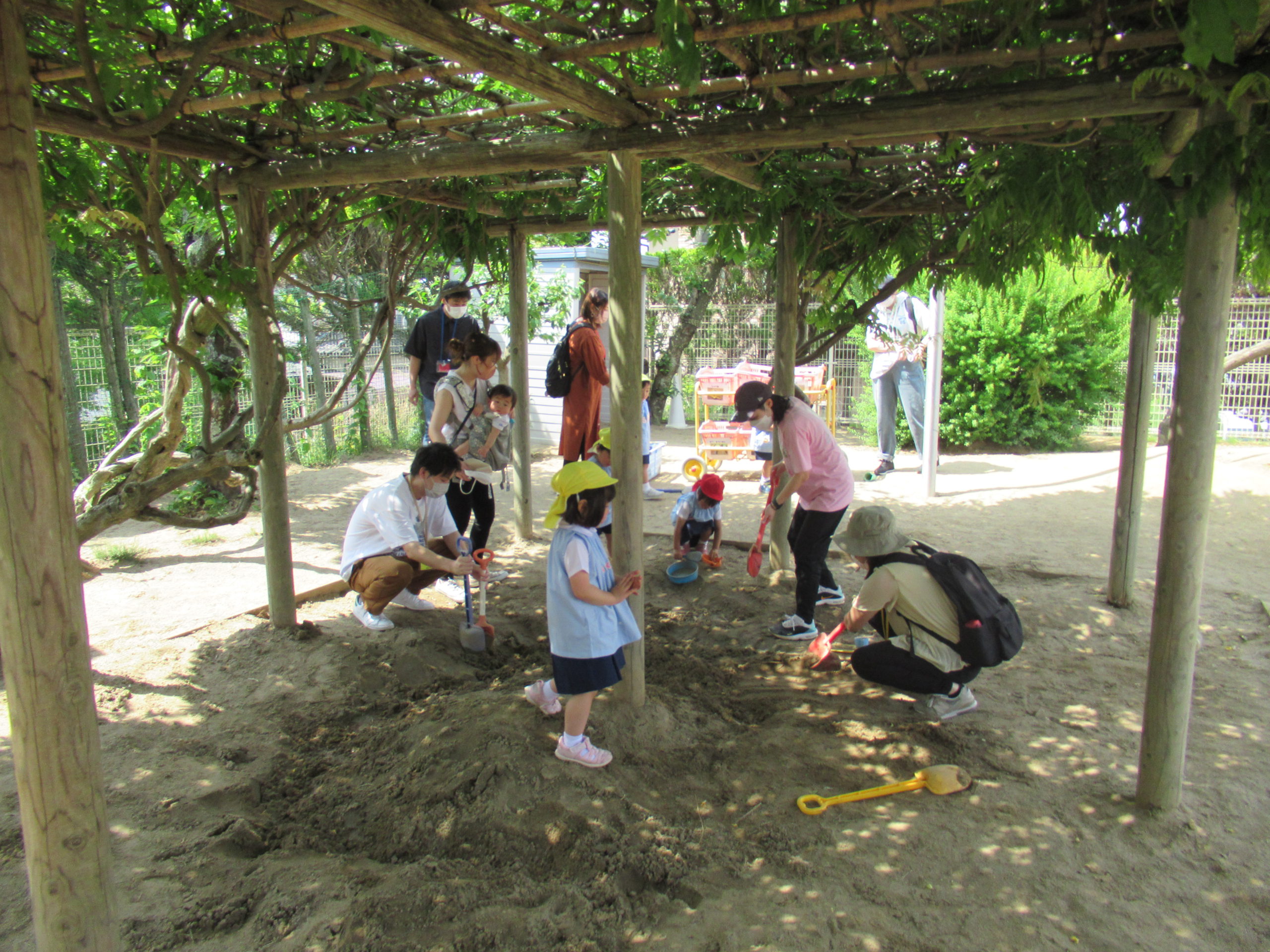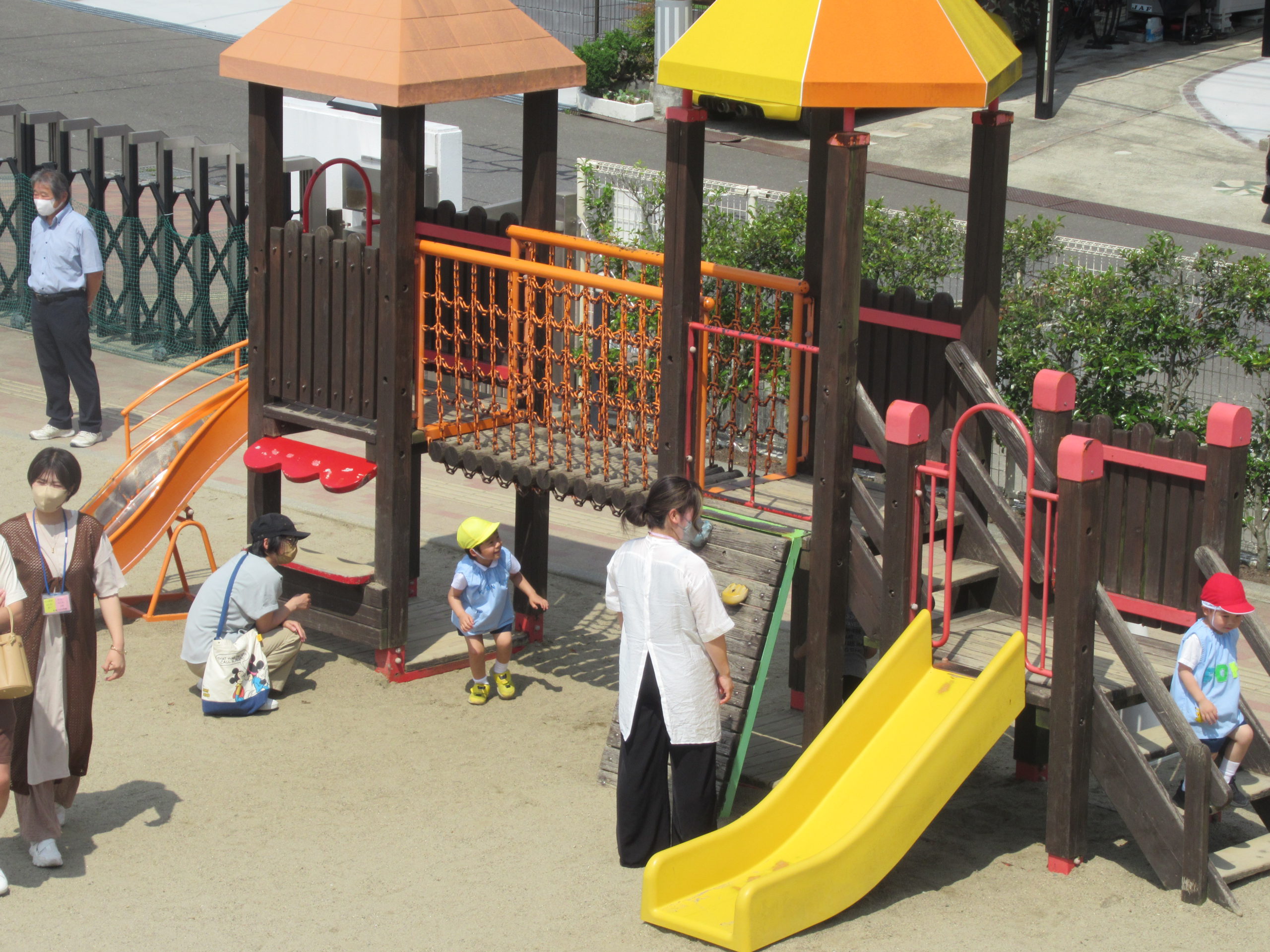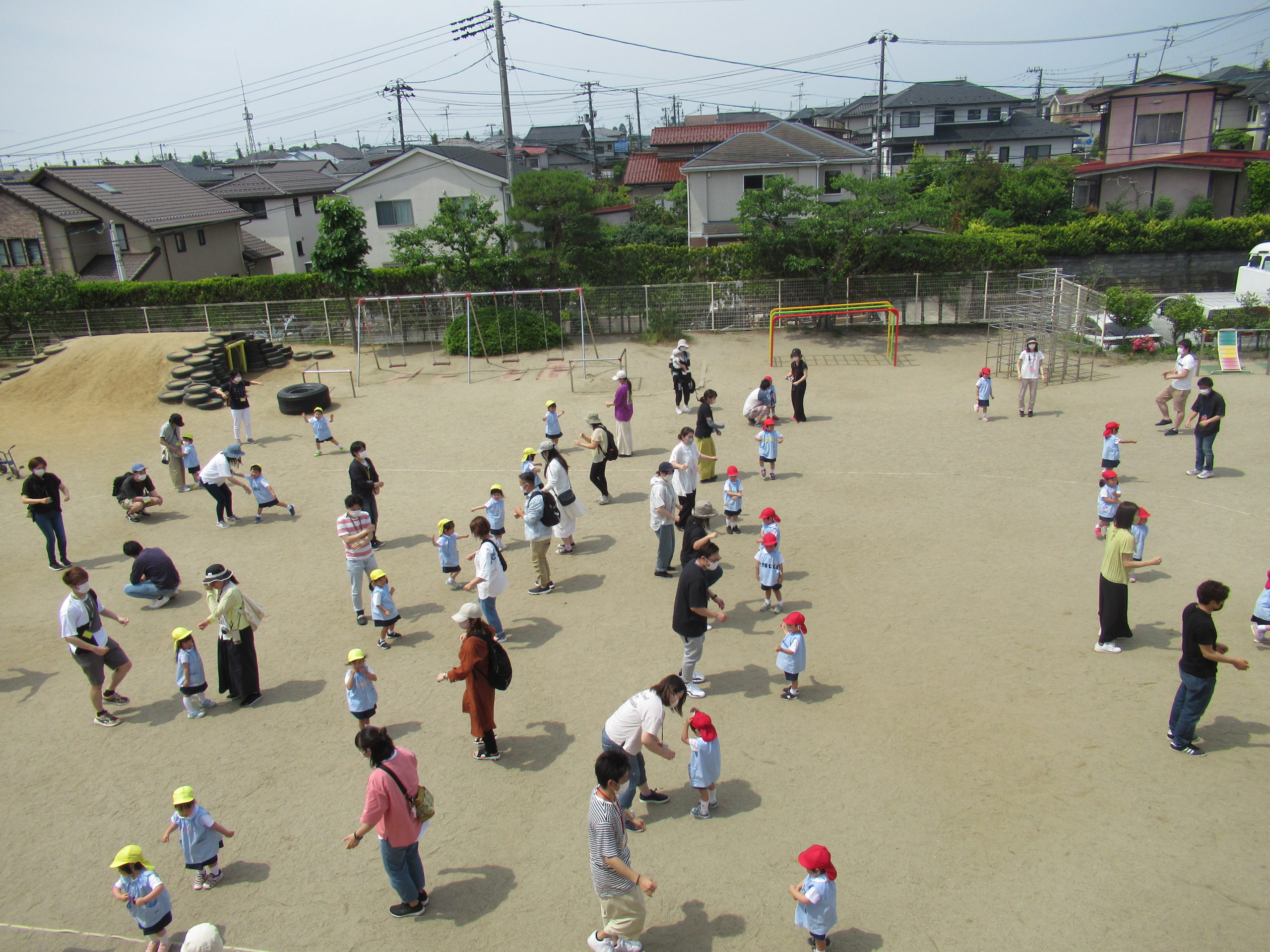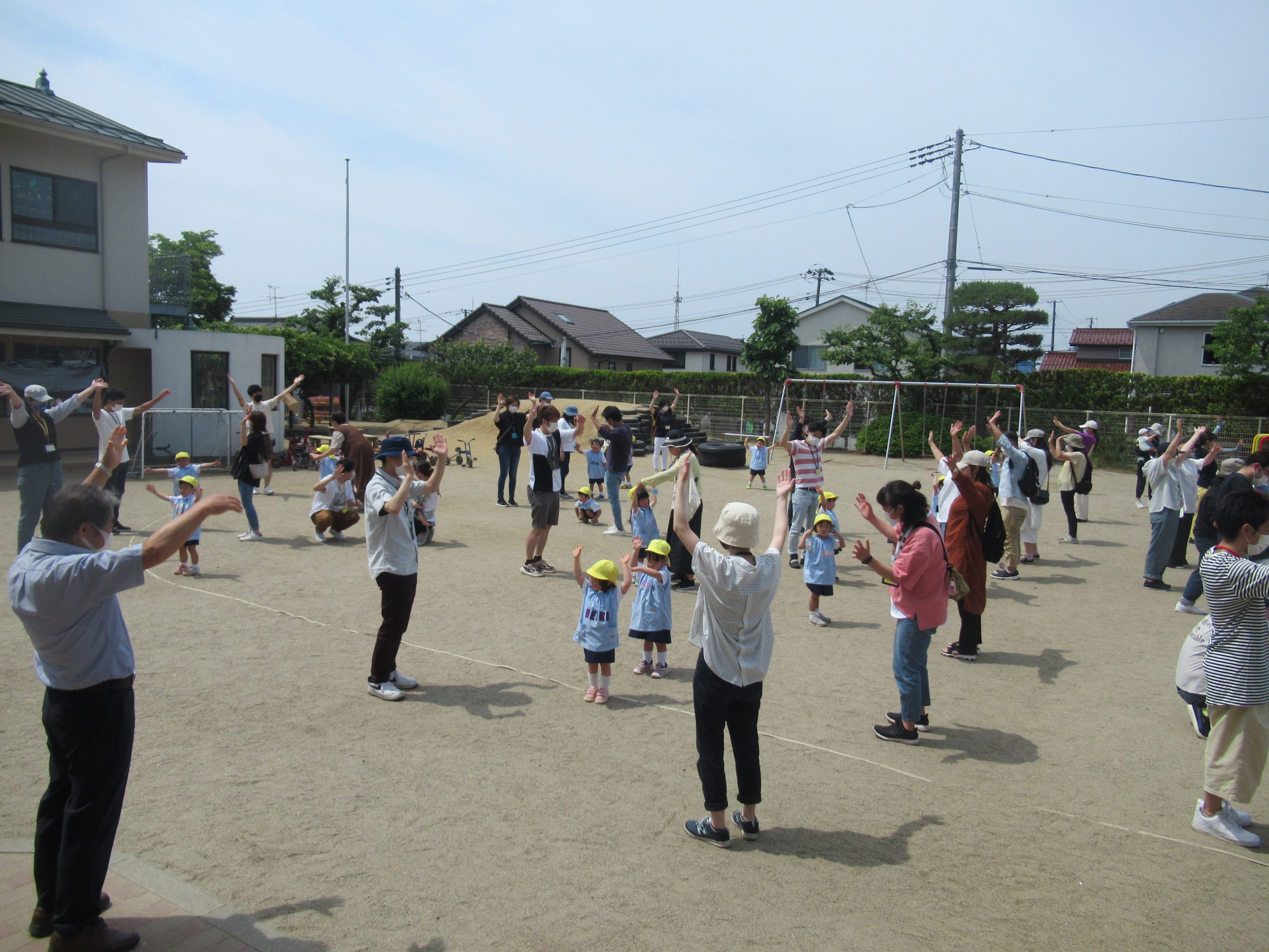 - 快晴の園庭で全体会です。