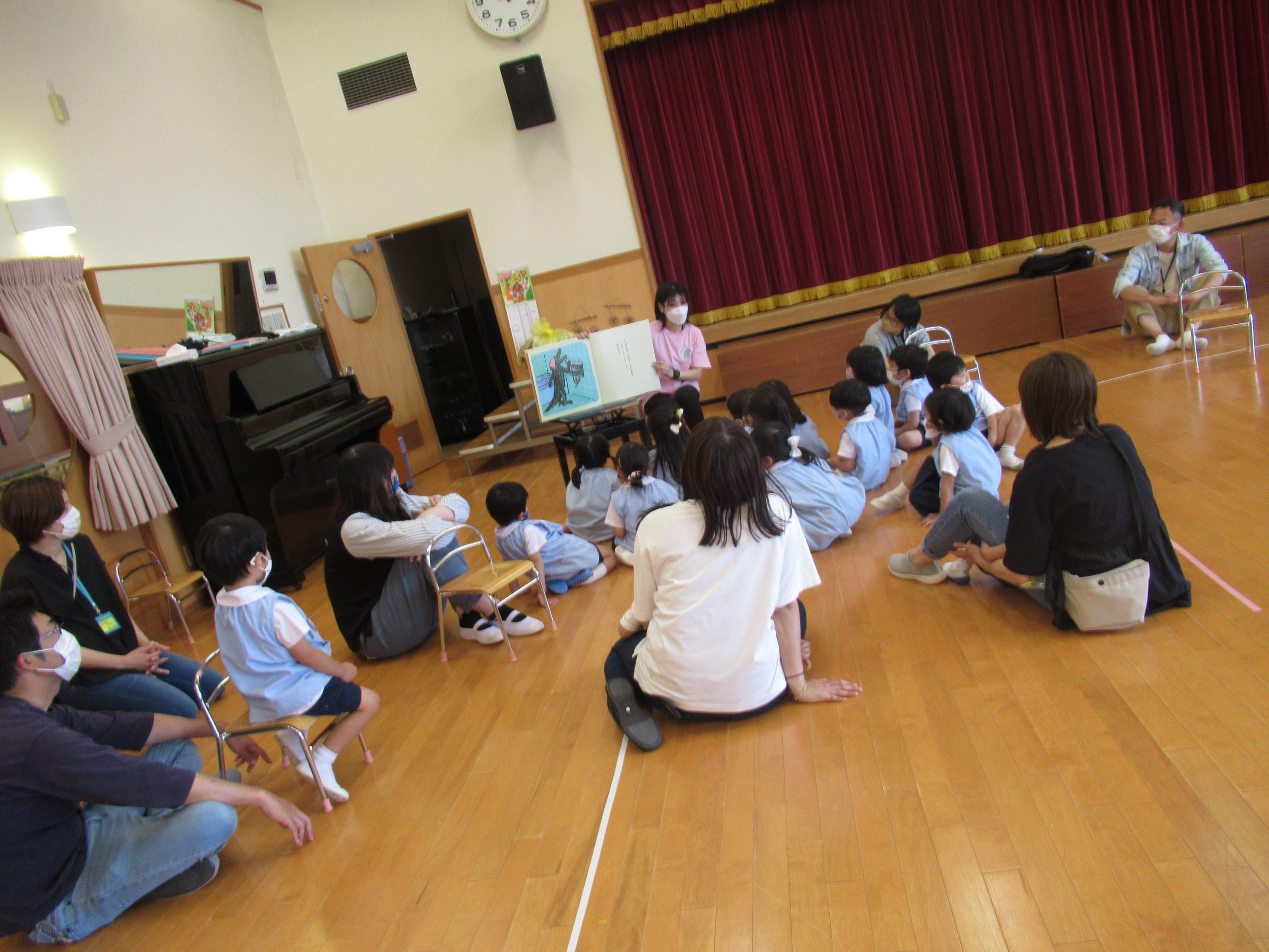 - 帰りの集まりでは絵本を見ました。