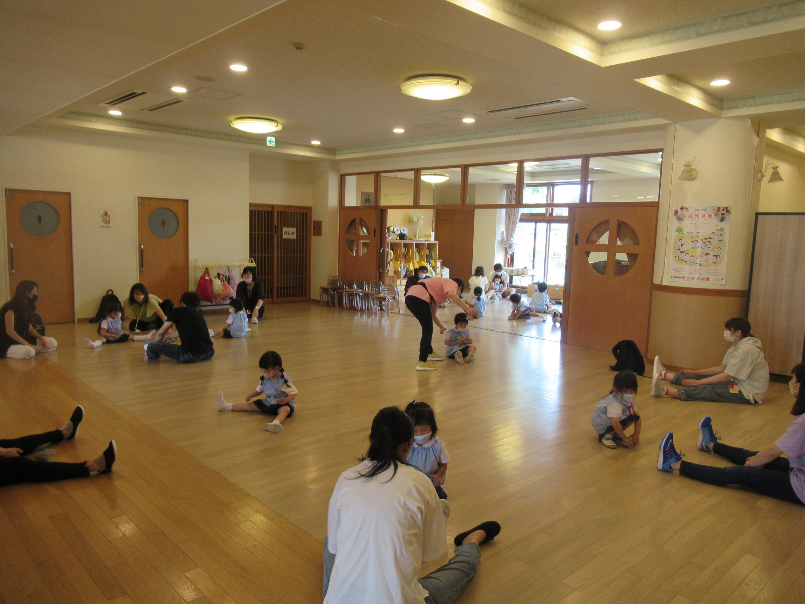 鶴ヶ谷幼稚園の年少組で「親子のつどい」を行ないました。入園して2ヶ月、進んで自分のことができるようになったこどもたちは、身支度の様子をおうちの方に見てもらい、とても嬉しそうにしていました。ふれあいあそびでは、親子で新聞紙を使って、かくれんぼをしたり、新聞紙から落ちないようにバランスをとったり、新聞紙で作ったボールリレーをしたりと、大いに盛り上がりました。
