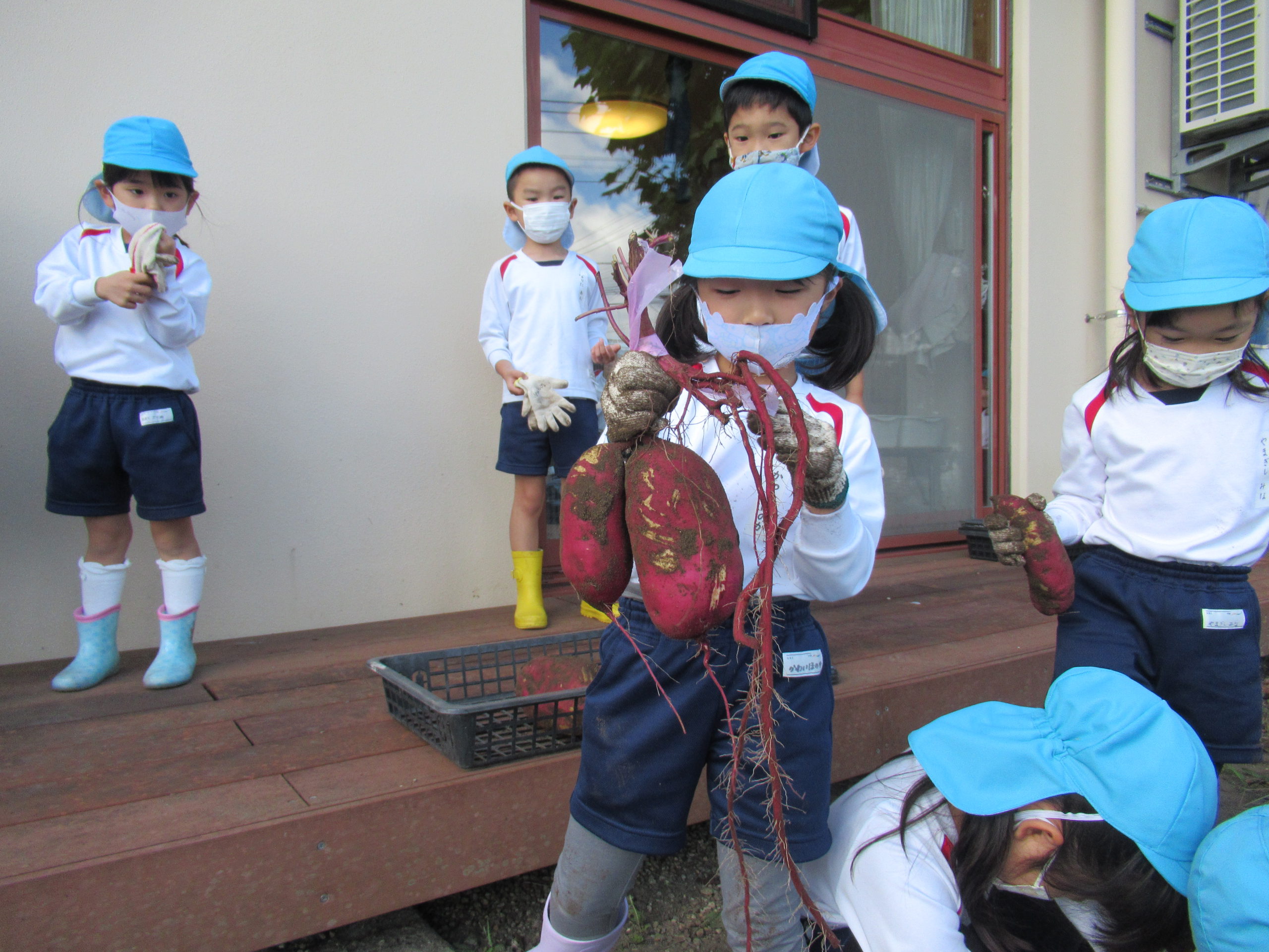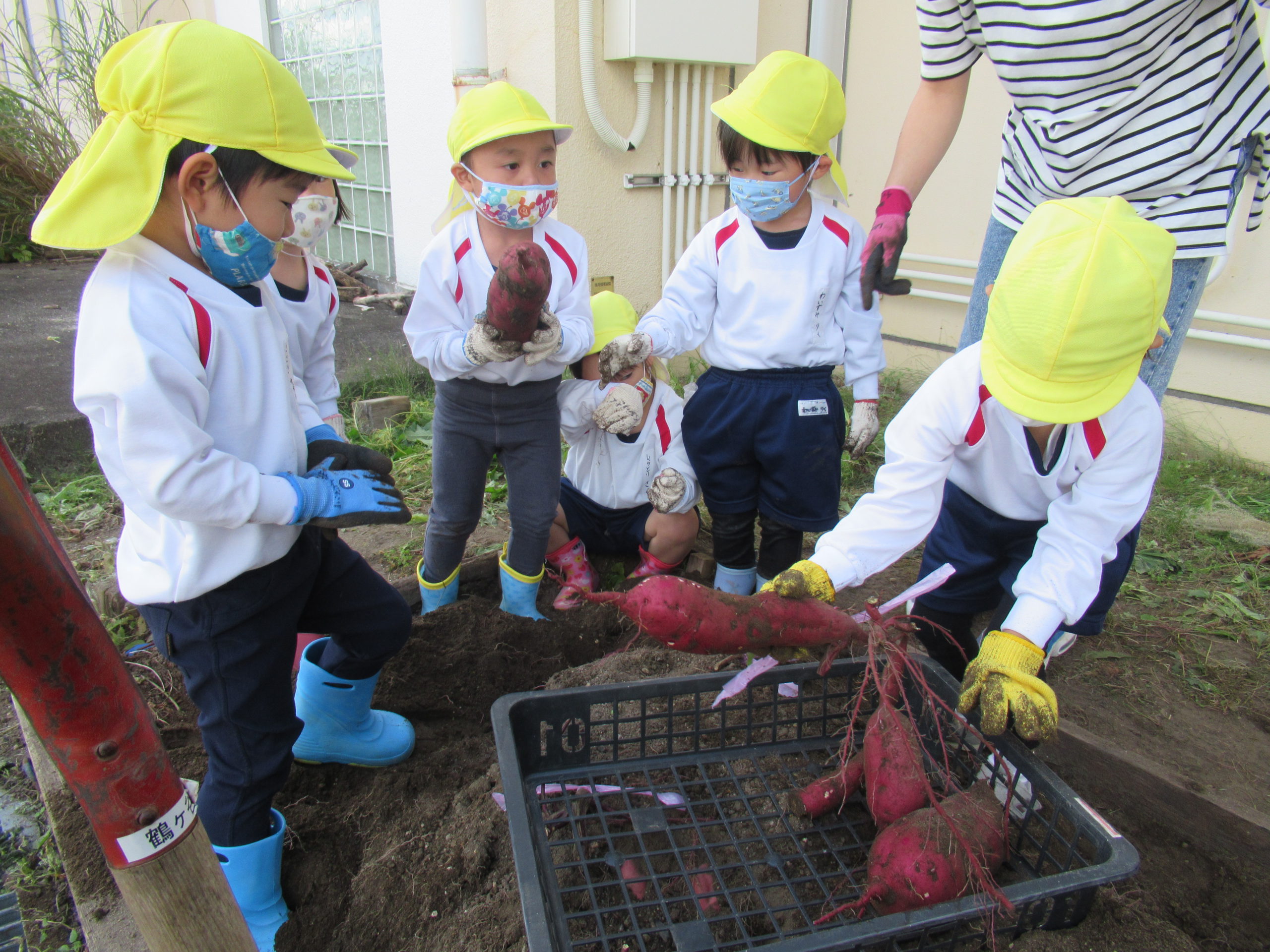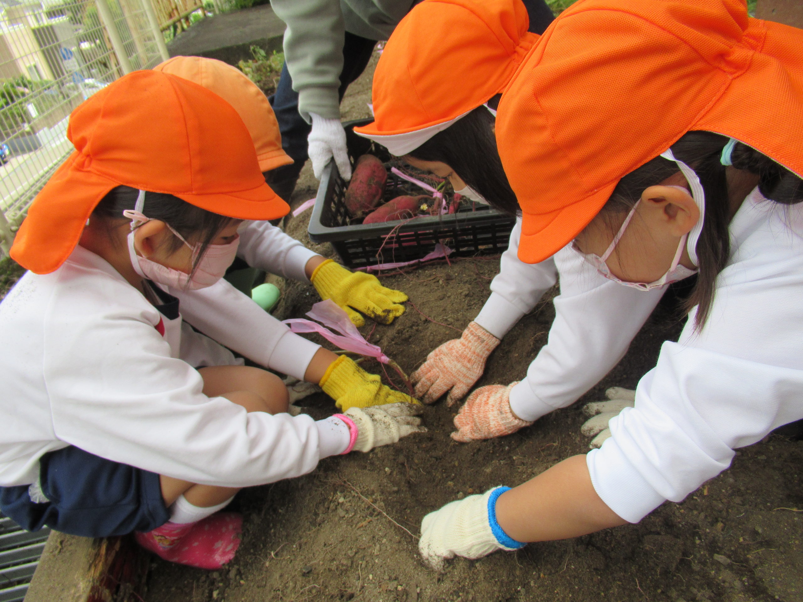 鶴ヶ谷幼稚園の畑でさつまいも掘りを行ないました。こどもたちは、「お芋はどのくらい大きくなったかな…」「たくさん穫れるといいね」と話し、収穫に期待を高めていました。実際に土を掘ると、「綺麗な紫色が出てきたよ」「土の中にまだあるよ」と話し、楽しんで取り組んでいました。