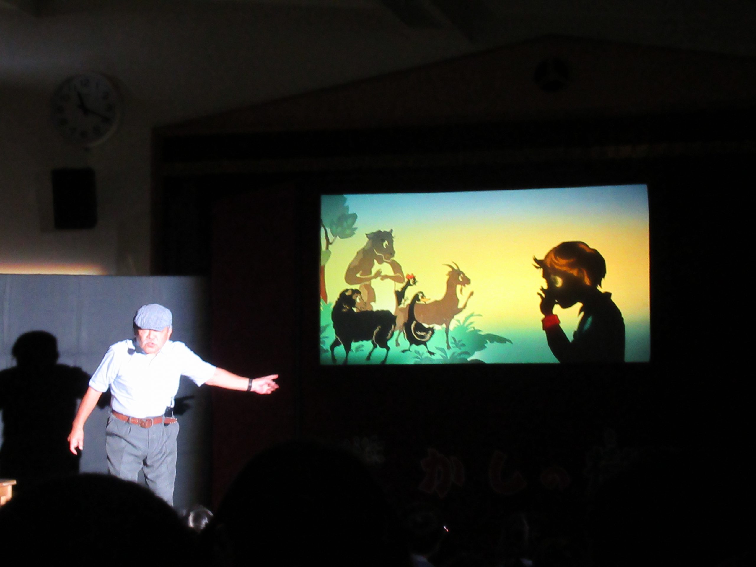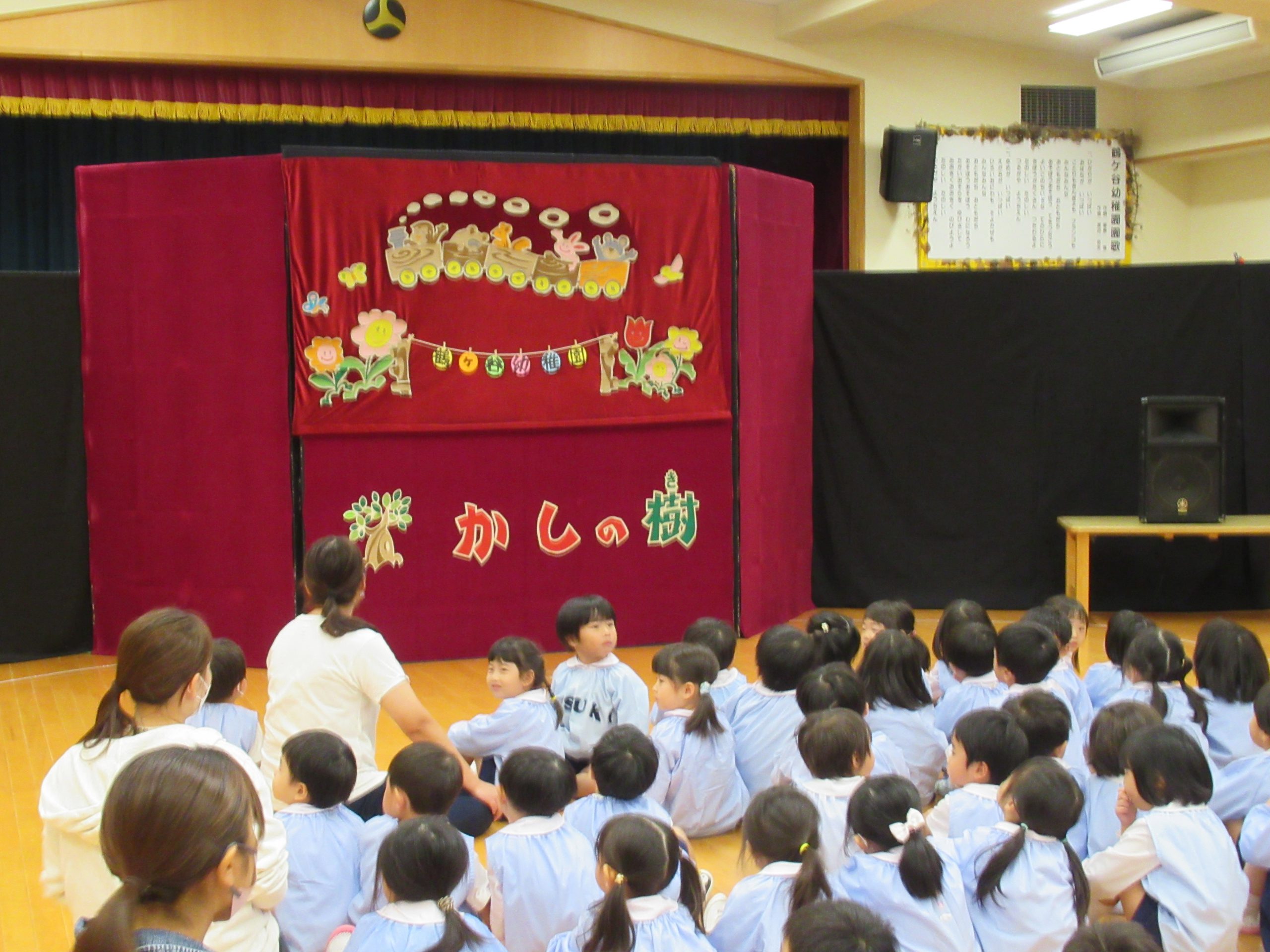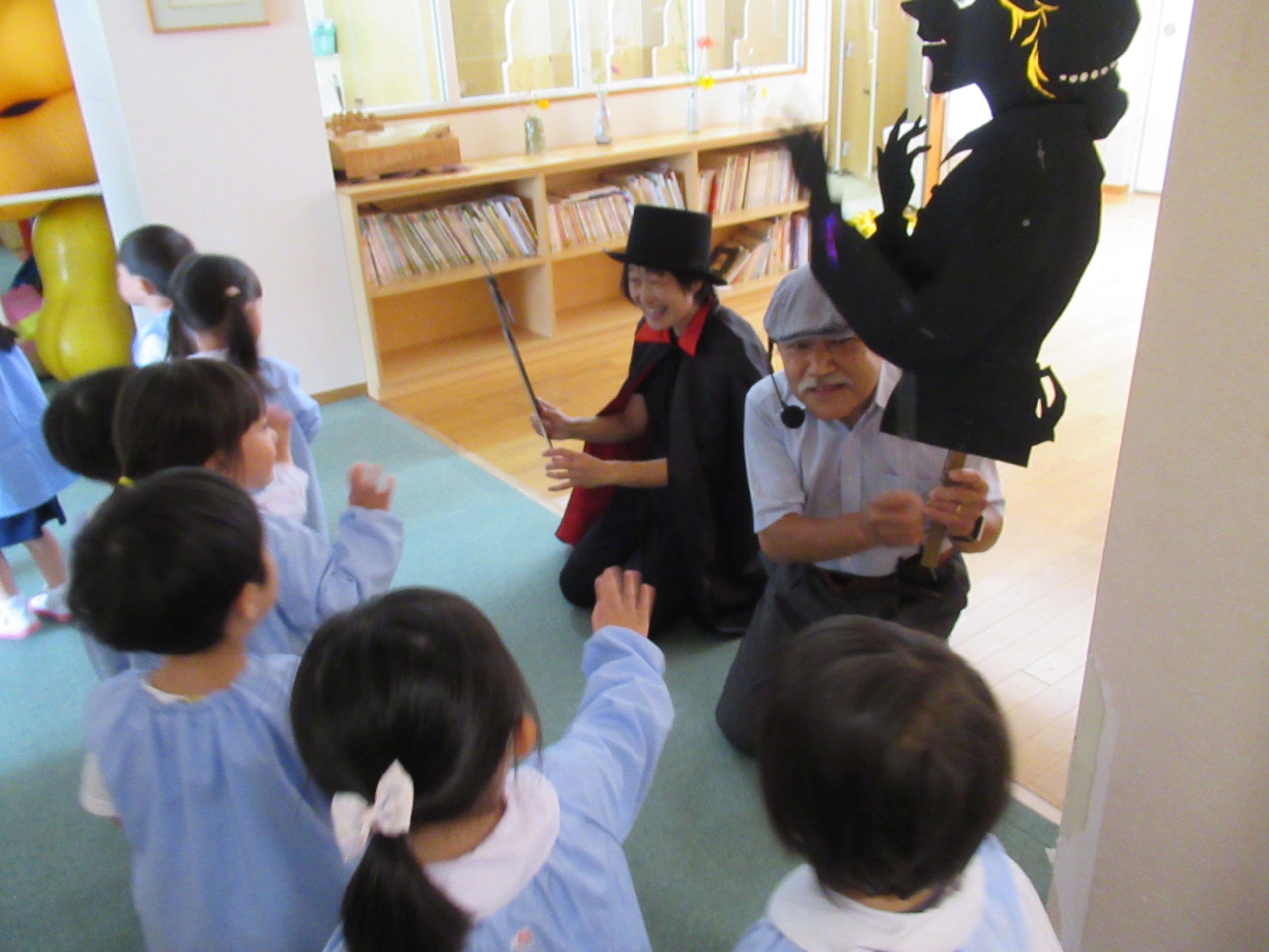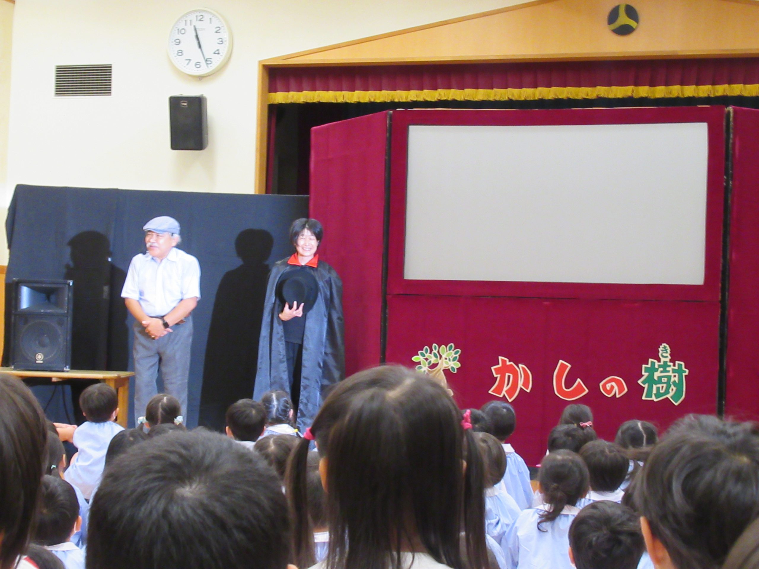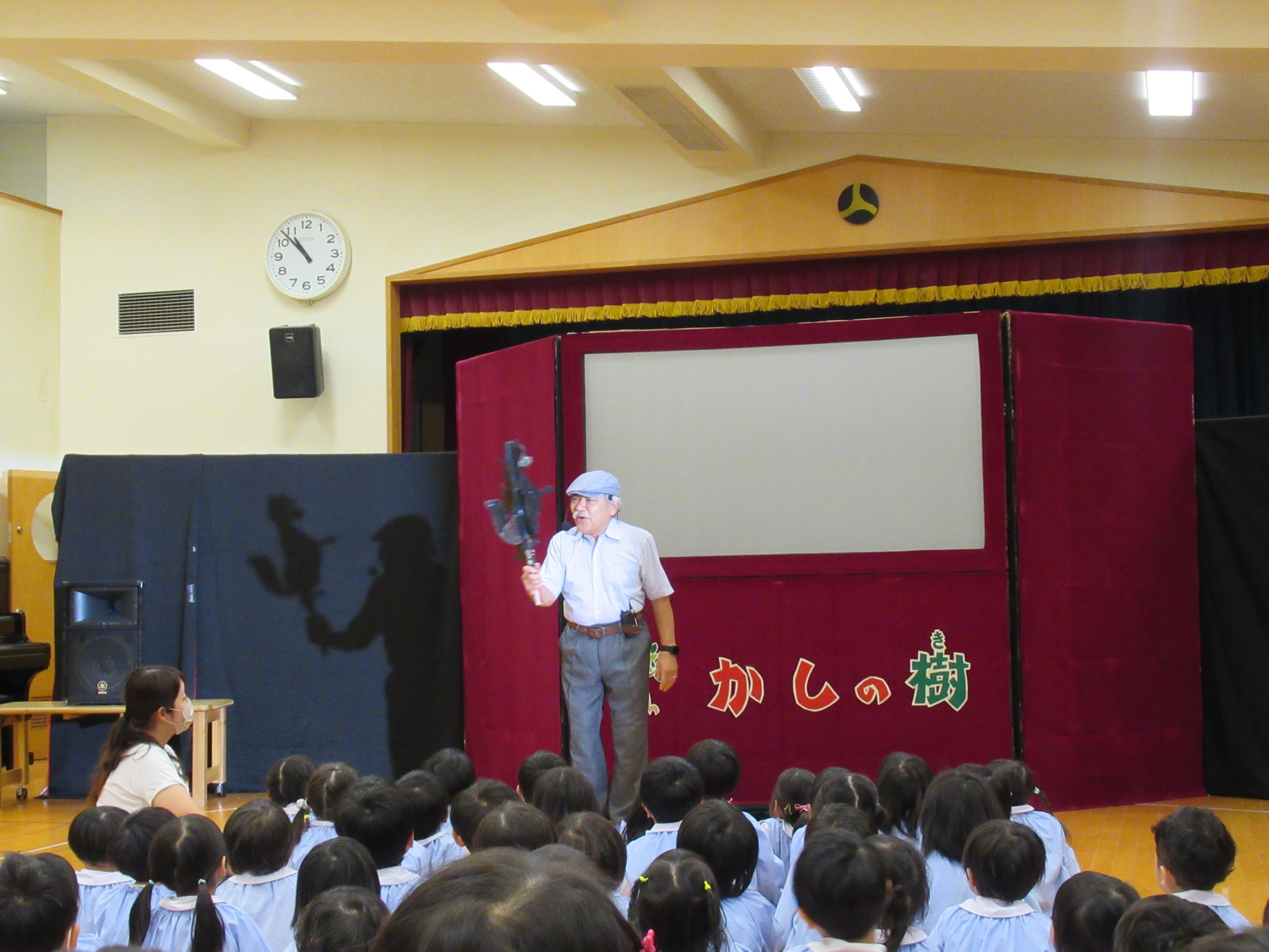 鶴ヶ谷幼稚園で、影絵劇団かしの樹さんの影絵劇「シルエットクイズ」「おかあさんのたんじょうび」を鑑賞しました。普段とは異なるホールを見て、「何が始まるのかな?」「わくわくしてきたよ」などと期待を高めていました。いざ影絵のクイズや劇が始まると、影と光で繰り広げられる世界に釘付けで、劇中に一緒に歌ったり拍手をしたりと大盛り上がりでした。終演後は、かしの樹さんが劇中で使用した人形を持って送ってくださいました。こどもたちは「とても面白かったよ」「またきてね」と、別れを惜しみながらも最後まで楽しい時間を過ごしました。
