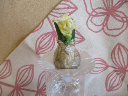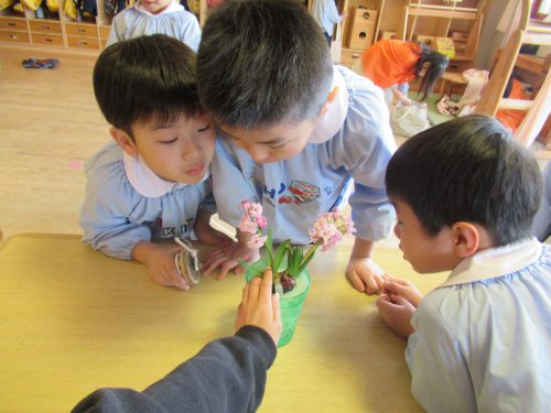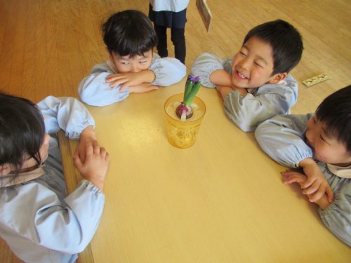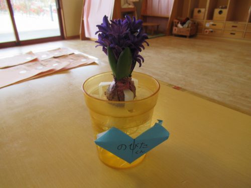 鶴ヶ谷幼稚園で育てているヒヤシンスの花が咲きました。芽を出す前からクラスでそれぞれに名前を付け、「何色の花が咲くのかな」と花が咲くのを心待ちにしていました。