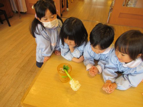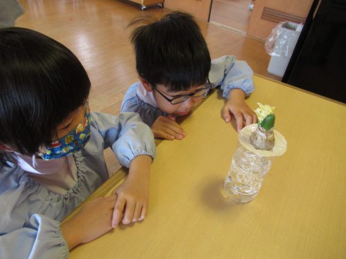 日々の観察をしながら「足が生えているみたいだね」と根が伸びてくる様子に驚いたり、芽が伸びる様子を見て「ツノみたいな形しているよ」と話したりと成長を喜んでいました。花が咲くと「いい匂いがするね」「かわいいね」とより親しみをもってかかわっていました。引き続き、観察しながら成長を見守っていきます。