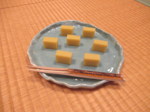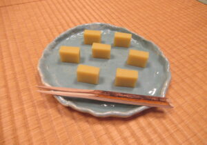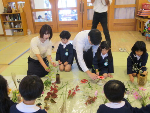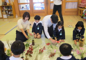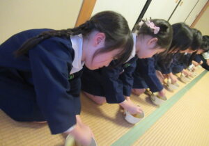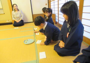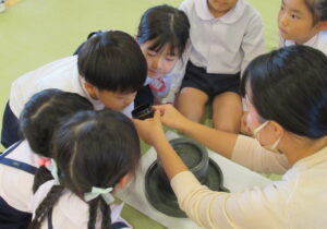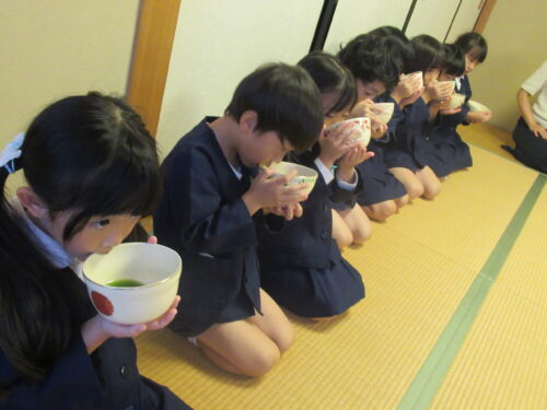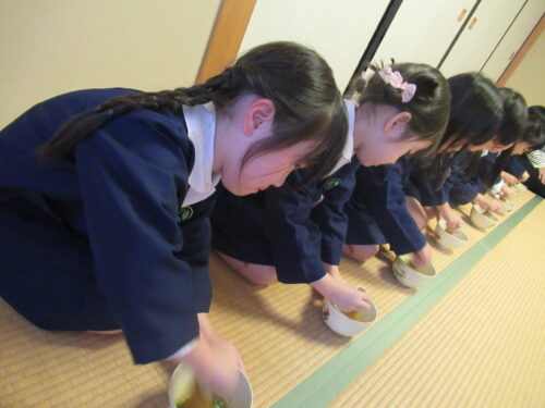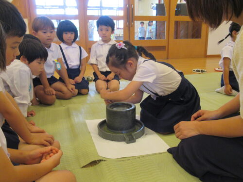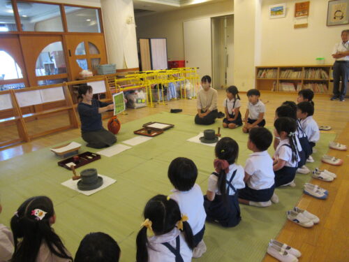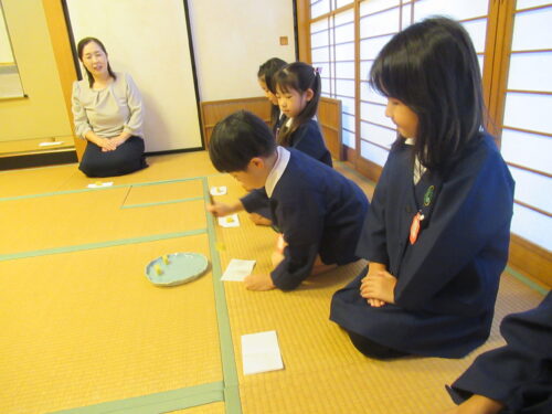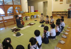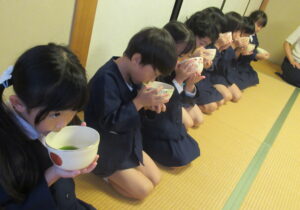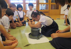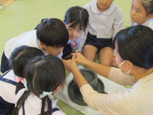 本日、鶴ヶ谷幼稚園の年長組で「茶道の時間」を行いました。今回は先日の石臼体験で碾茶を挽いた抹茶を使用し、自分たちでお茶点てに挑戦しました。「おいしくなぁれ…」と心を込め、真剣に点てる姿が見られました。一味違う抹茶の味にこどもたちは大満足のようでした。また、今月のお菓子、「芋ようかん」は、お箸を上手に使い美味しくいただきました。次回の12月茶道の時間では自分で点てたお茶を、お家の方に振舞います。